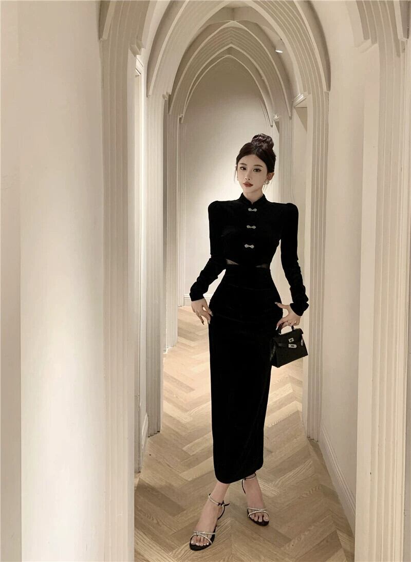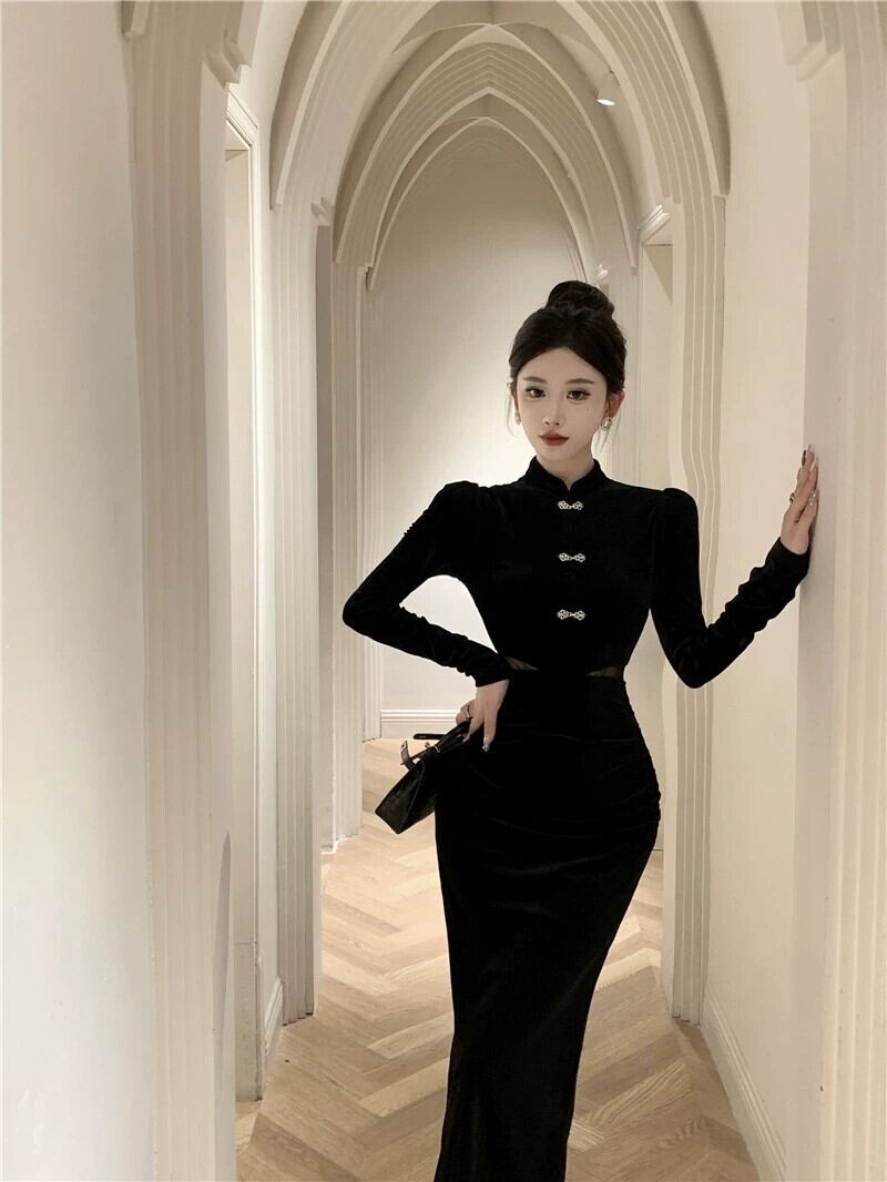 フランスのイブニングドレスの女性の秋と冬の年次総会、エレガントで高級なブラックゴールドベルベットの改良された若々しいチャイナドレス オータム 秋物 ウィンター 冬物 yeyij1703313846