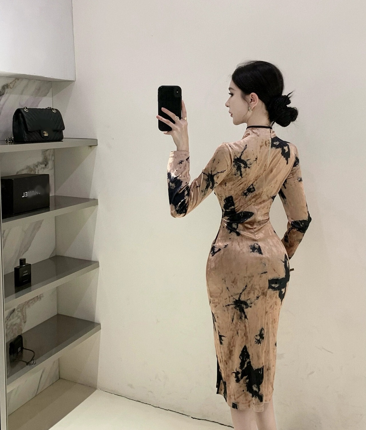 秋と冬のチャイナドレス女性の新しい中国風改良版レトロ中華民国風プリント若いゴールドベルベットミドルドレス オータム 秋物 ウィンター 冬物 yeyij39094690148