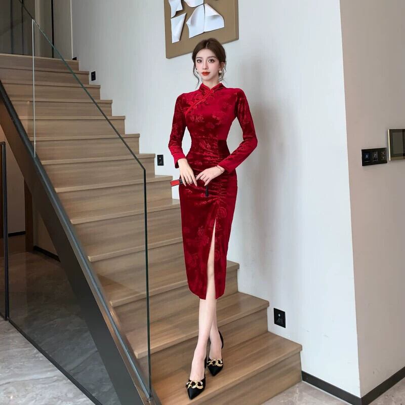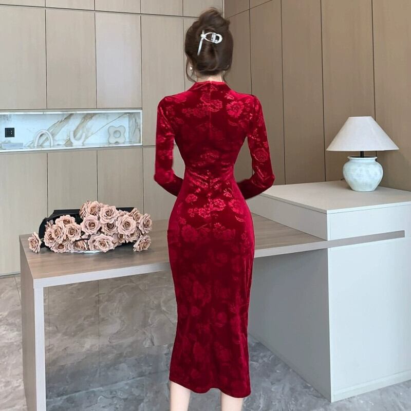 赤いチャイナドレス女性の秋と冬のクリスマスと新年のパーティー若い改良された中国風のゴールドベルベットのミドル丈のドレス レッド オータム 秋物 ウィンター 冬物 yeyij98376359255