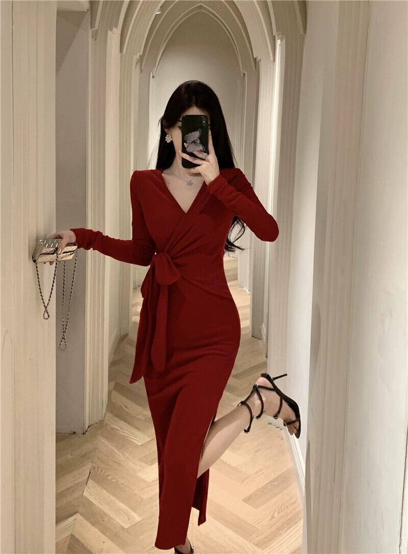 赤い干支の年の女性の秋冬の気質女神モデルのハイエンドのセクシーなVネックミドル丈ドレス レッド オータム 秋物 ウィンター 冬物 yeyij42281217145