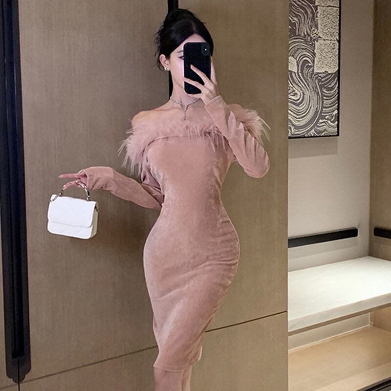 イブニングドレスハイエンドライトラグジュアリーニッチ女性のハイエンドフランス年次総会毛皮のような長袖セクシーなワンショルダードレス ロング yeyij67189148730