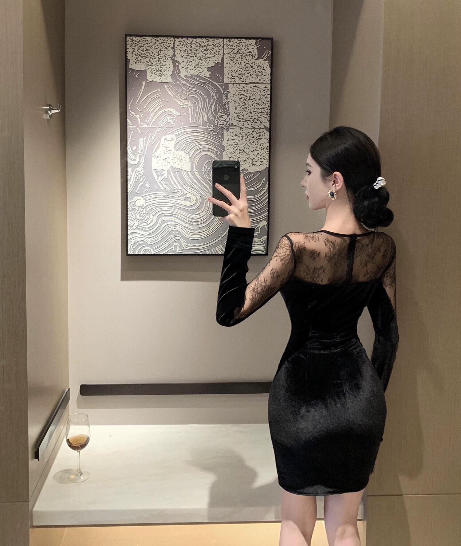 生放送女性アンカーのPogenicハイエンドセクシーシースルーレーススプライシングゴールドベルベット長袖お尻カバードレス ロング yeyij27626059800