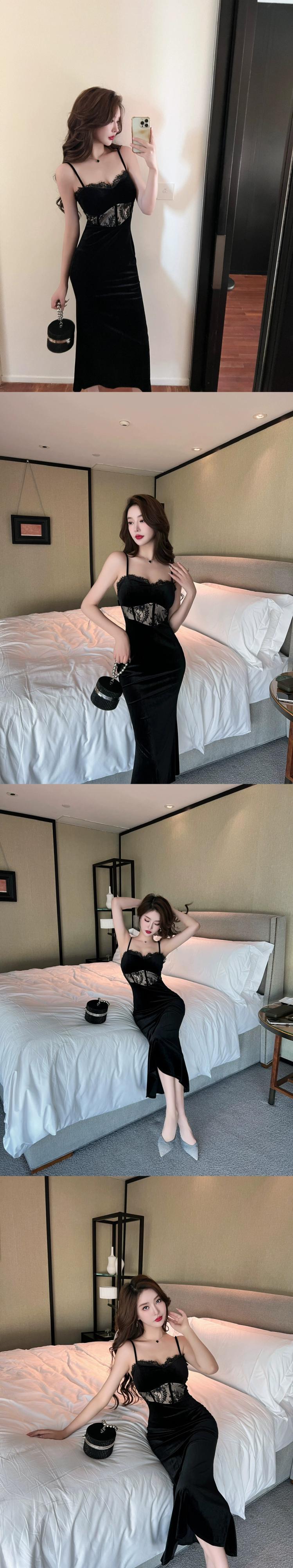 イブニングドレスの女性、ハイエンドナイトクラブナイトクラブセクシーなレーススプライシングゴールドベルベットミッドレングスサスペンダードレス yeyij91368253125