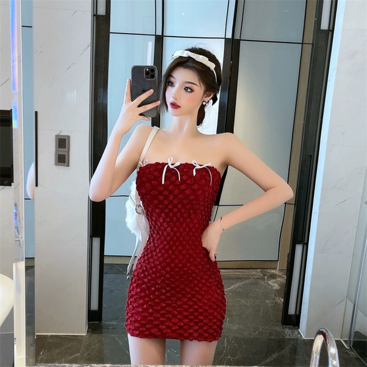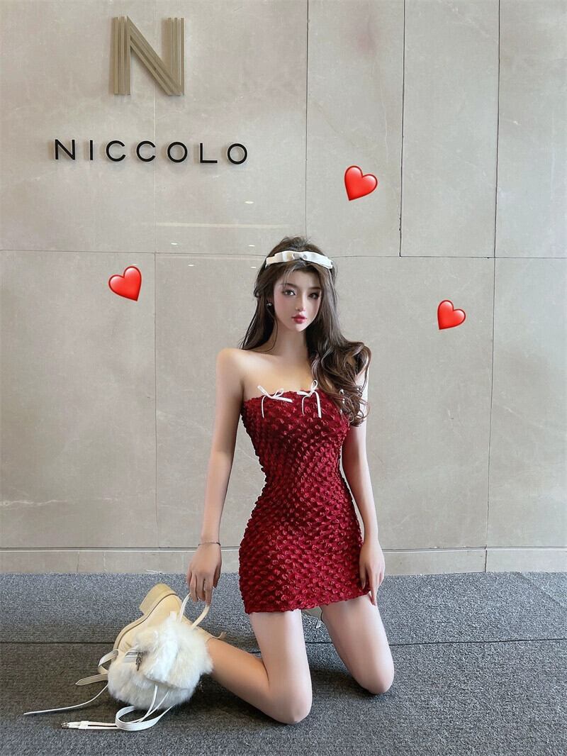 生放送の女性アンカーのポージェニックな高級クリスマス シャツは、甘い赤いセクシーなヒップカバーのチューブトップ ドレスを着ています レッド 大人ガーリー スウィート キュート カジュアル yeyij96634898697