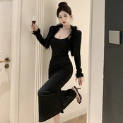 バンケットイブニングドレス、ハイエンドの黒の成熟した女性スタイルのスーツ、セクシーなサスペンダードレス付きの女性の小さなコート ブラック yeyij50355286928