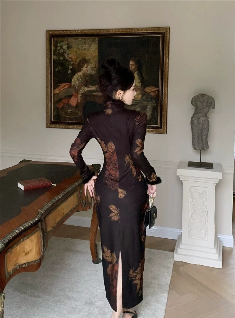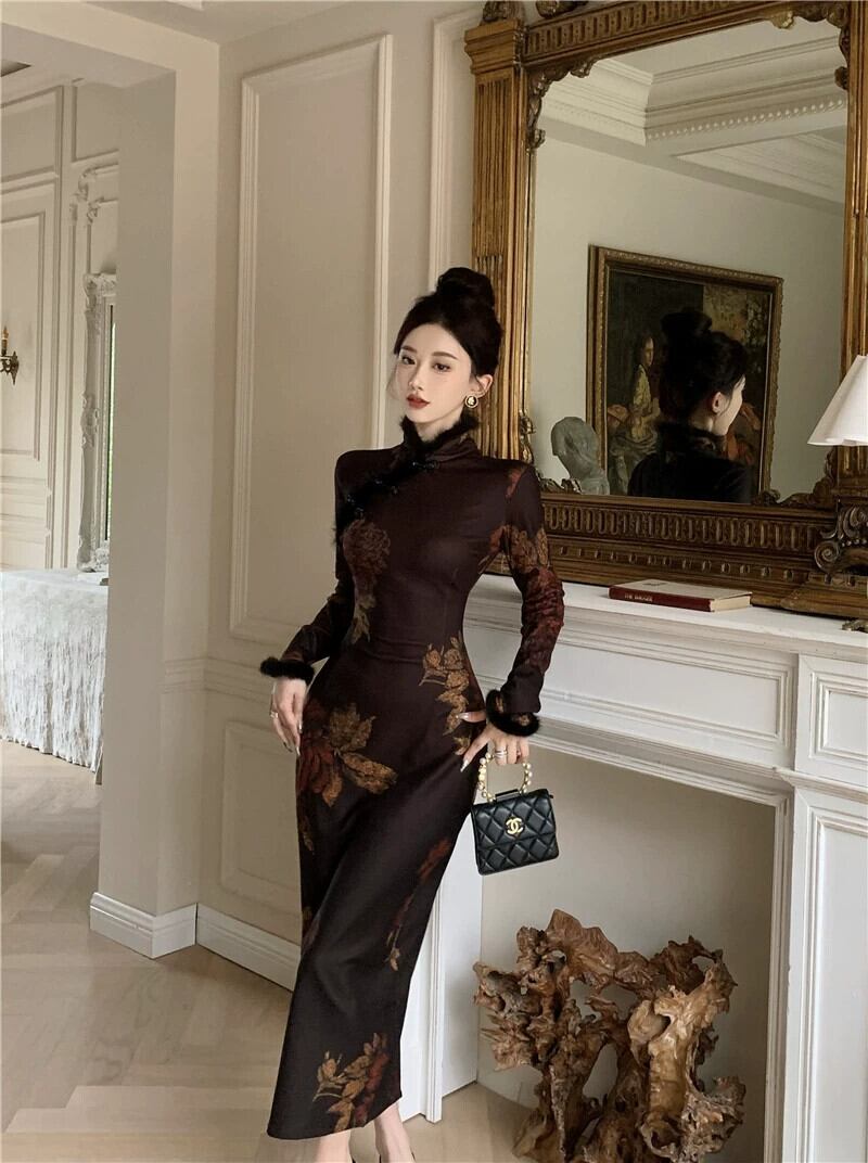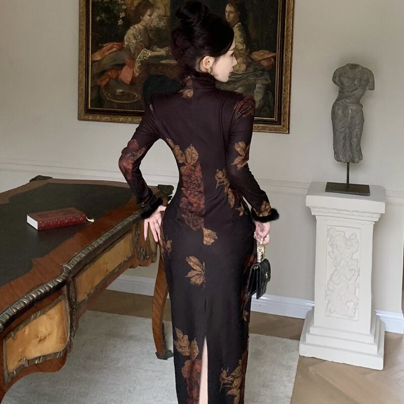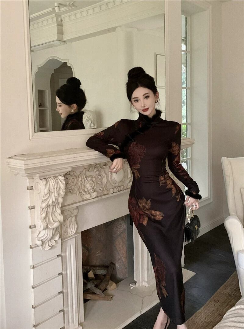 チャイナドレス女性の新しい中国風の秋と冬の若いスタイルのハイエンドの気質レトロな中華民国スタイルのプリントミッドレングスドレス オータム 秋物 ウィンター 冬物 yeyij85194719788