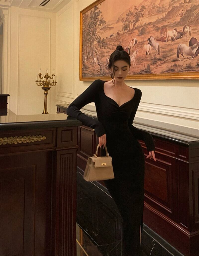 干支年ブルゴーニュ女性の秋と冬の軽い成熟したロイヤル スタイルのセクシーな V ネック ニット ミッドレングス ボトリング ドレス オータム 秋物 ウィンター 冬物 Vネック yeyij29149225464