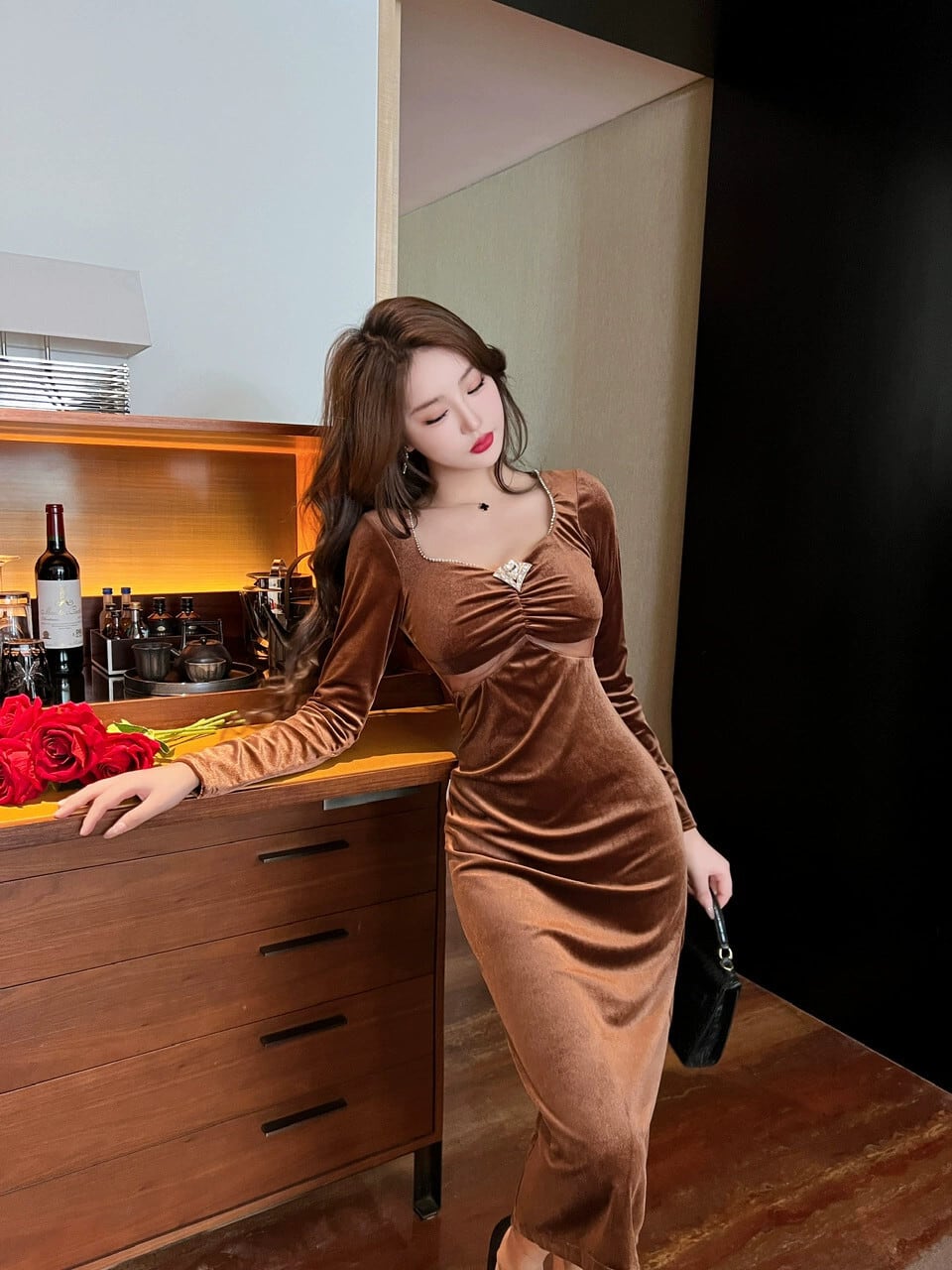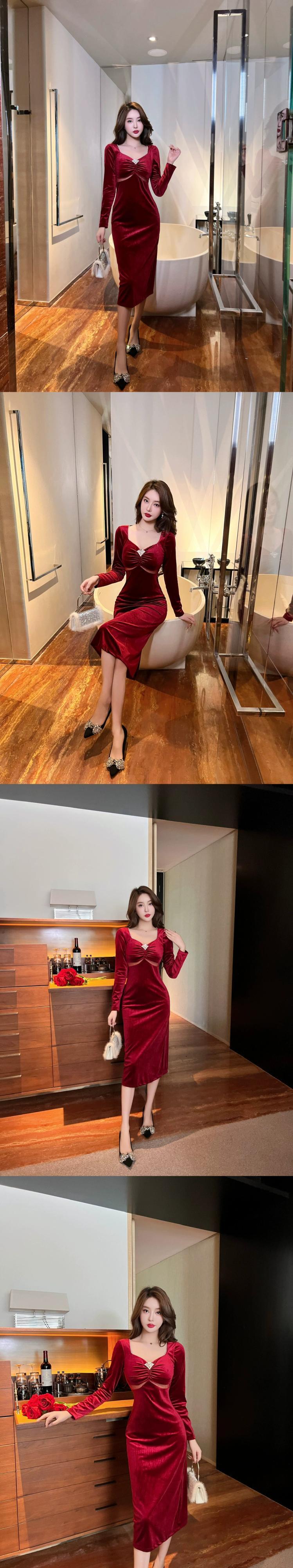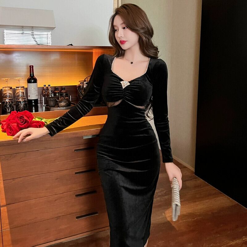 イブニングドレスの女性の秋と冬のハイエンドナイトクラブナイトクラブゴールドベルベットのセクシーな V ネック長袖ミッドレングスドレス ロング オータム 秋物 ウィンター 冬物 Vネック yeyij34048242009
