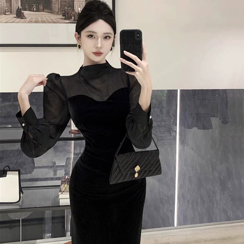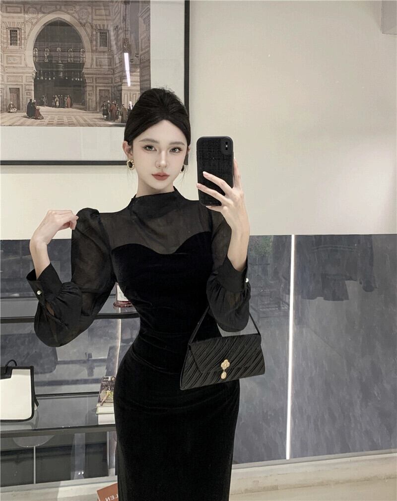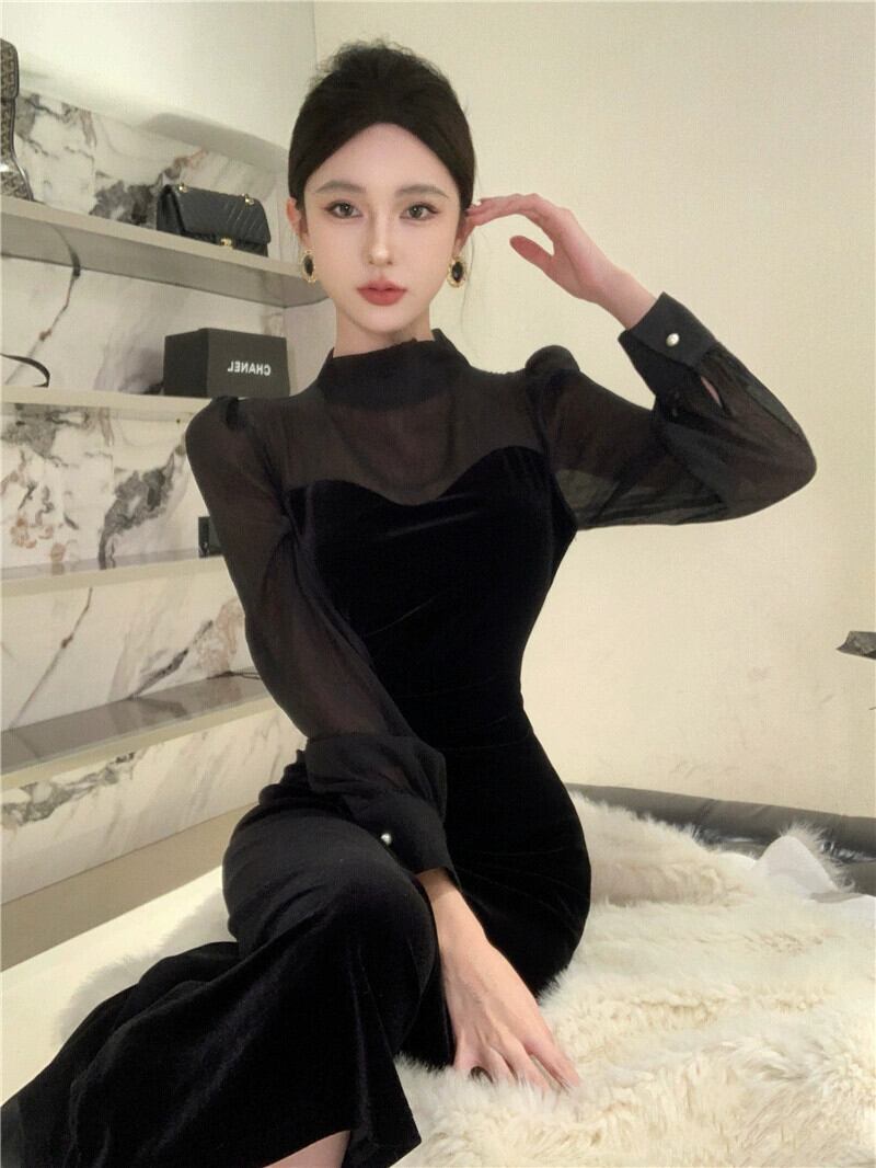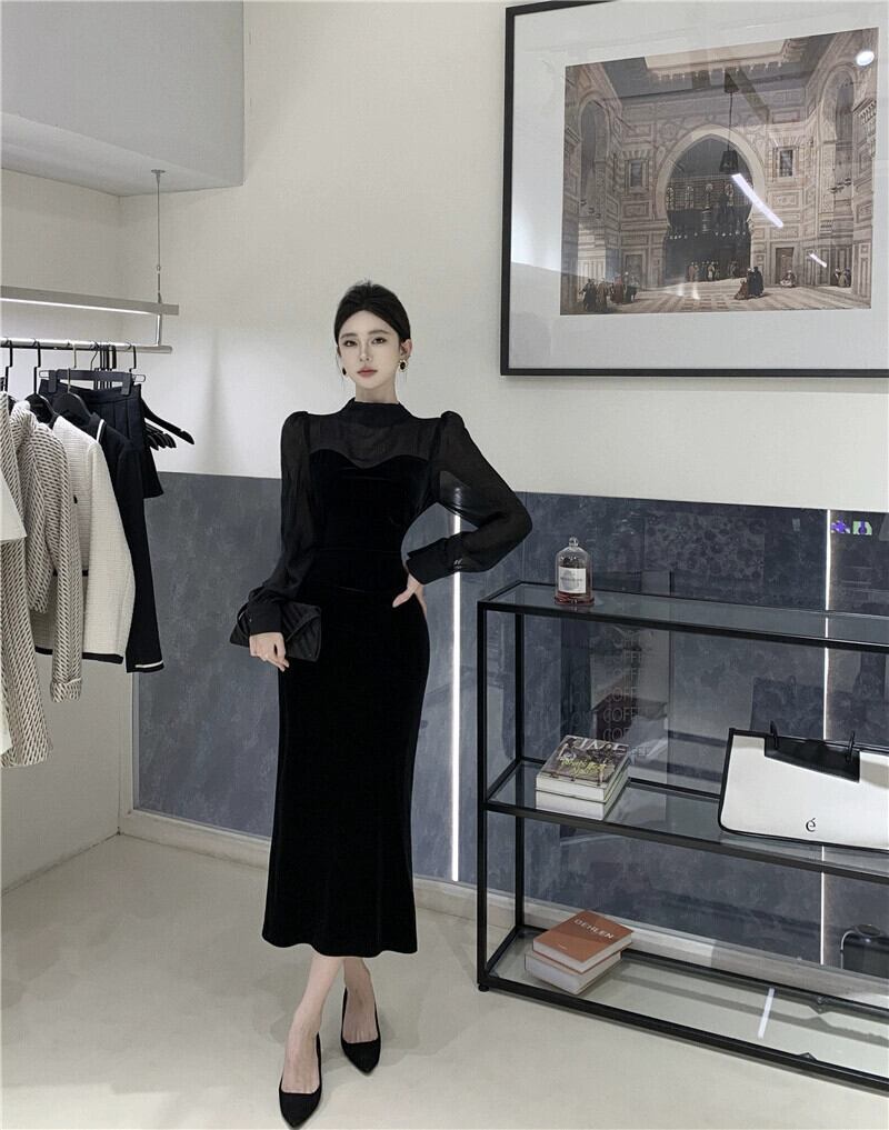 -エンドレディライクスタイルのフレンチメッシュスプライシングブラックゴールドベルベットドレス秋冬。 オータム 秋物 ウィンター 冬物 yeyij69775410087