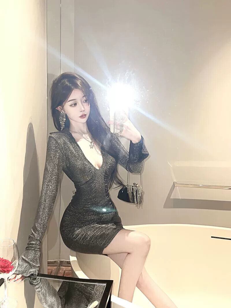 ナイトクラブバーディスコ服女性、光沢のあるシルク、セクシーな V ネック、痩身、ヒップハグ長袖ボトリングドレス ロング Vネック yeyij87821983015