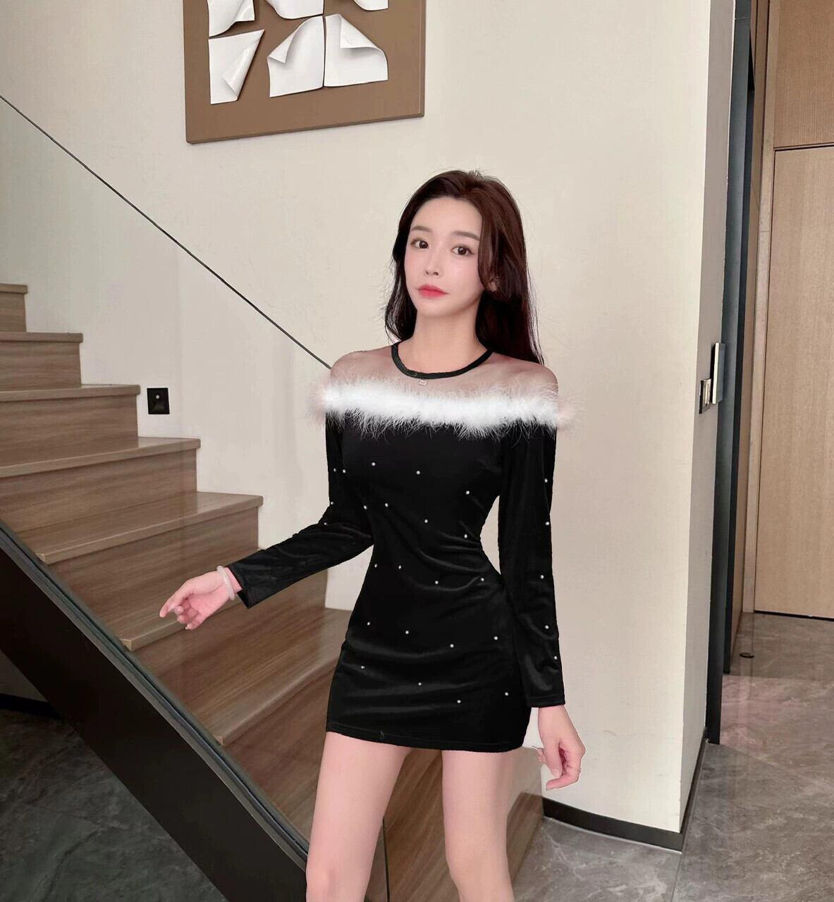 ナイトクラブの女性のナイトクラブの作業服クリスマスレッドセクシーなメッシュスプライシング長袖ヒップドレス ロング yeyij45700128354