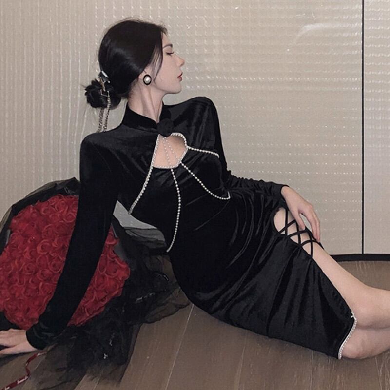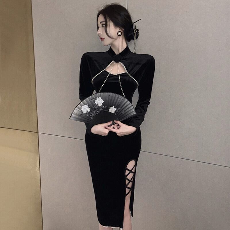 チャイナドレス イブニングドレス ハイエンド ライト 高級 ニッチ 中国風 セクシー スリット ブラック ゴールド ベルベット ミッドレングス ドレス yeyij91622451292