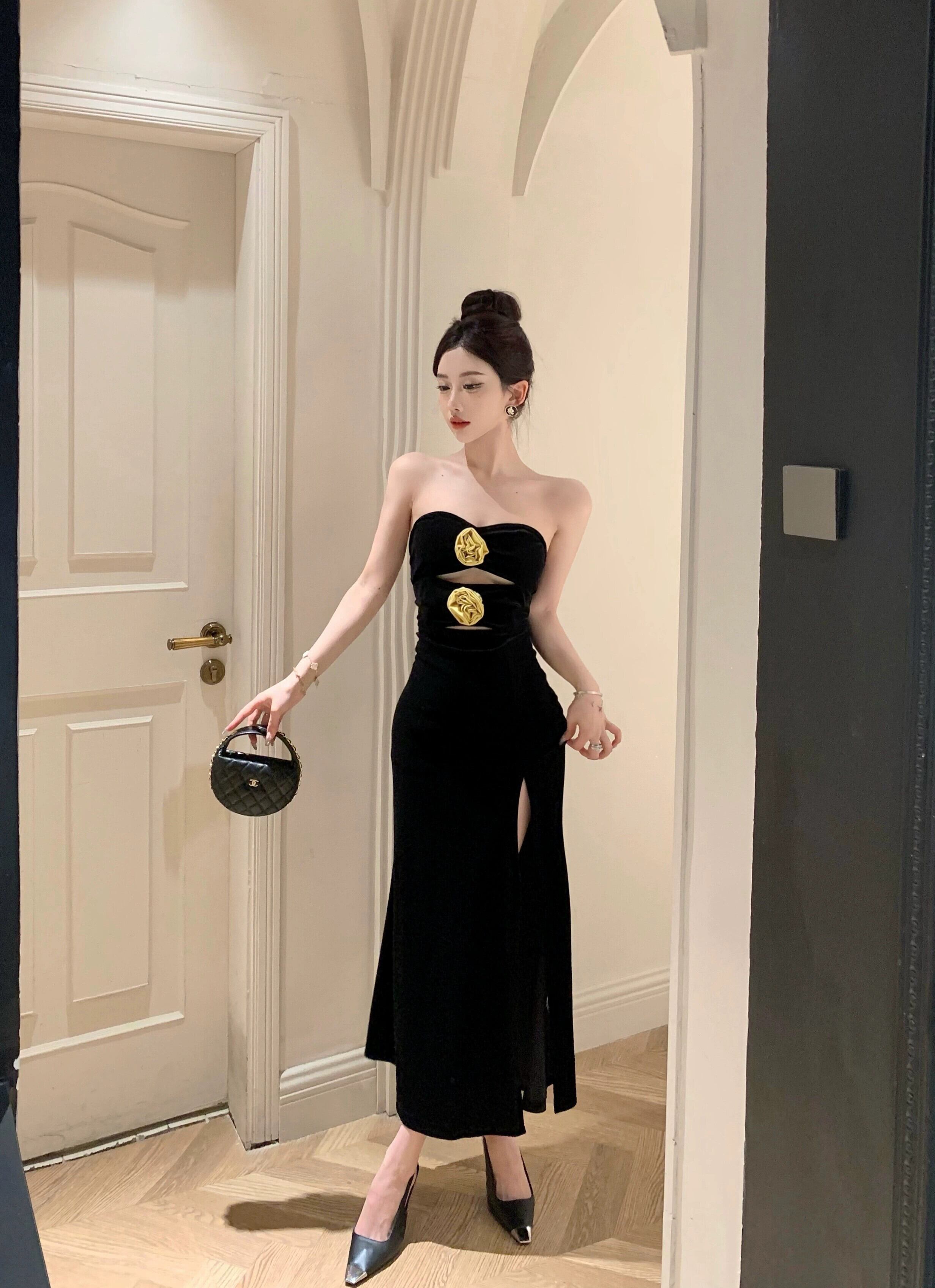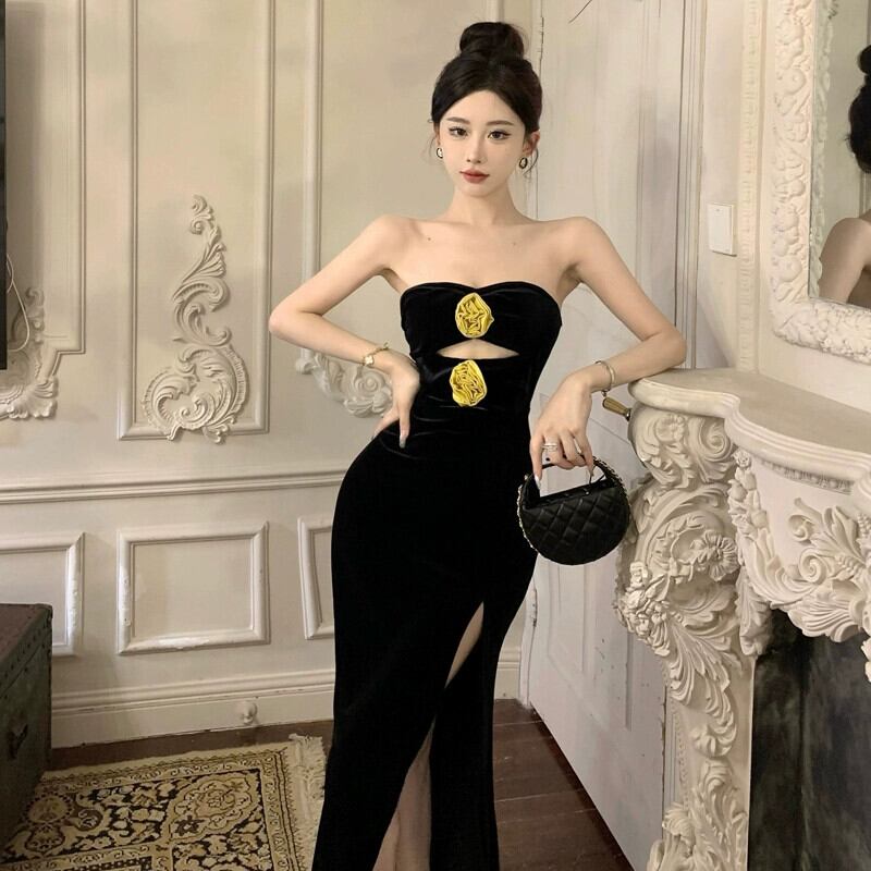 フランスのイブニングドレスの女性、ハイエンドの秋と冬の黒の宴会ゴールドベルベットのセクシーな中空と見事なチューブトップドレス ブラック オータム 秋物 ウィンター 冬物 yeyij66651604638