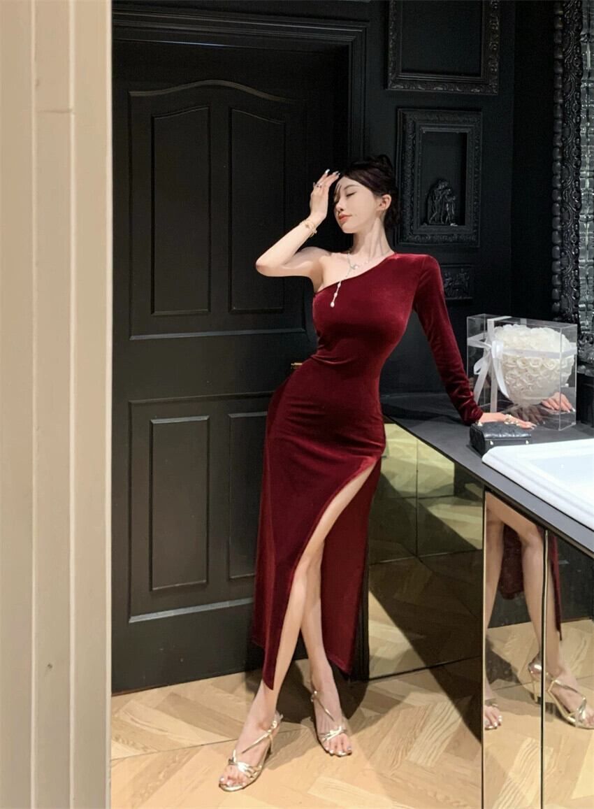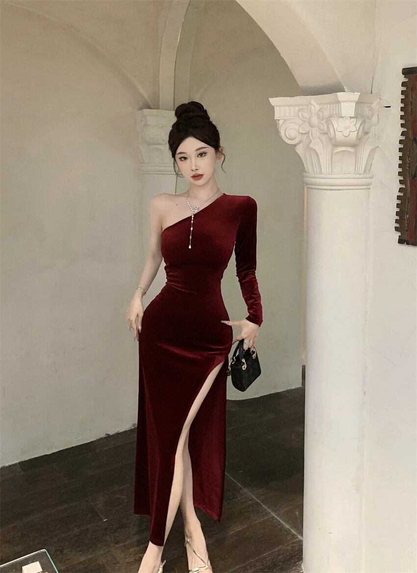 イブニングドレスの女性 2023 新しい秋と冬のセクシーなスリットロングスカートスロープネックワンショルダーオフショルダーゴールドベルベットドレス オータム 秋物 ウィンター 冬物 yeyij98156563876