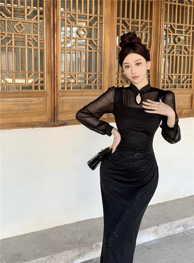 チャイナドレス女性の新しい中国風のハイエンドの若いスタイルの黒の光沢のある淑やかな気質メッシュスプライシングミッドレングスドレス ブラック yeyij42605667716