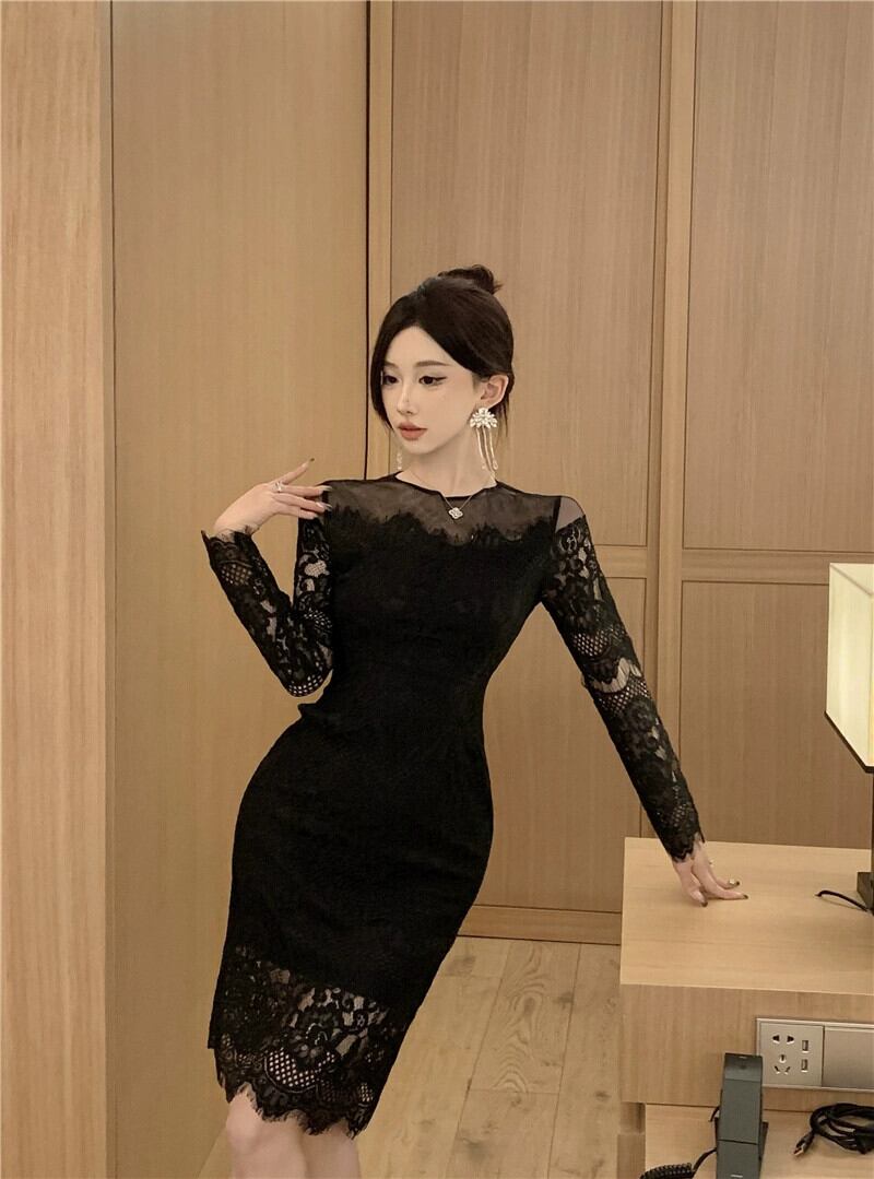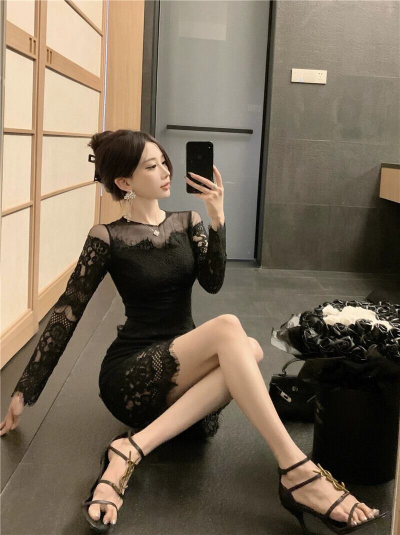 生放送服女性アンカー pogenic ハイエンド気質セクシーなレースメッシュスプライシング長袖ヒップカバードレス ロング yeyij14150245203