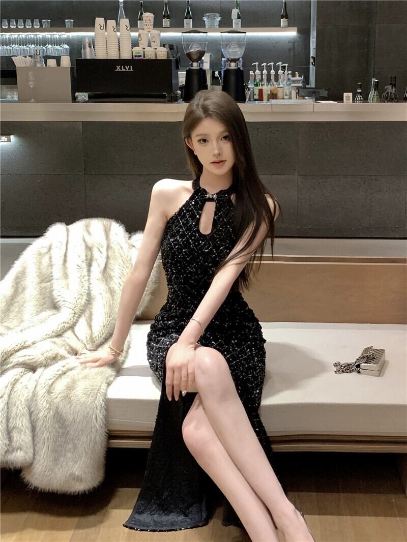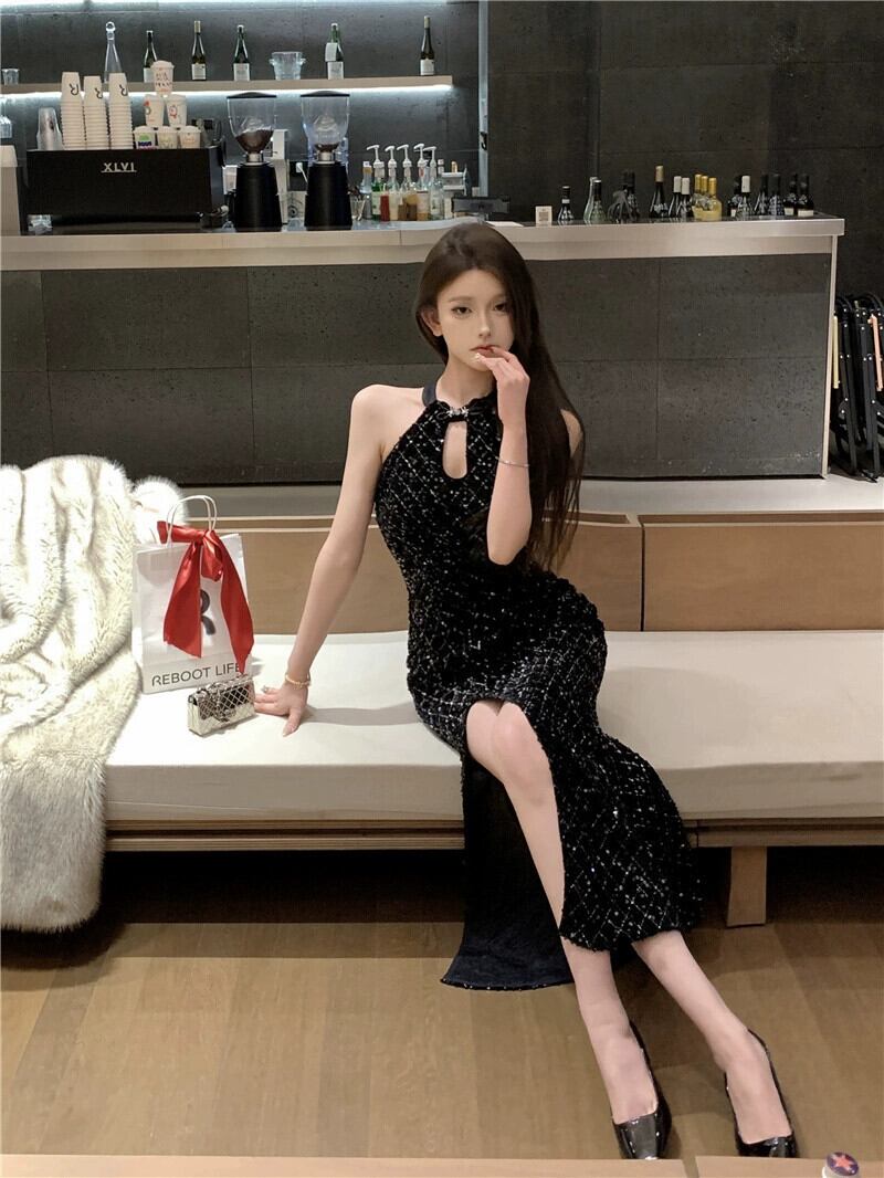 ニッチバンケットイブニングドレス女性、ハイエンド、若くてセクシーなオフショルダーゴールドベルベット修正された黒チャイナドレス ブラック yeyij85522592517