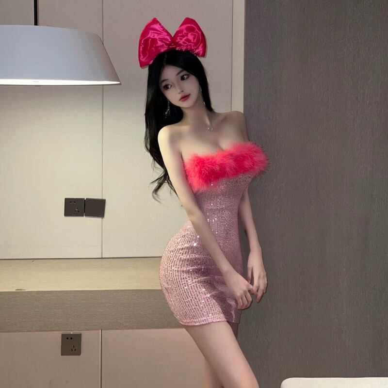 ナイトクラブ婦人服バーディスコ服オーバーオール輝くスパンコール毛皮のようなセクシーなワンショルダーチューブトップドレス yeyij91867510100