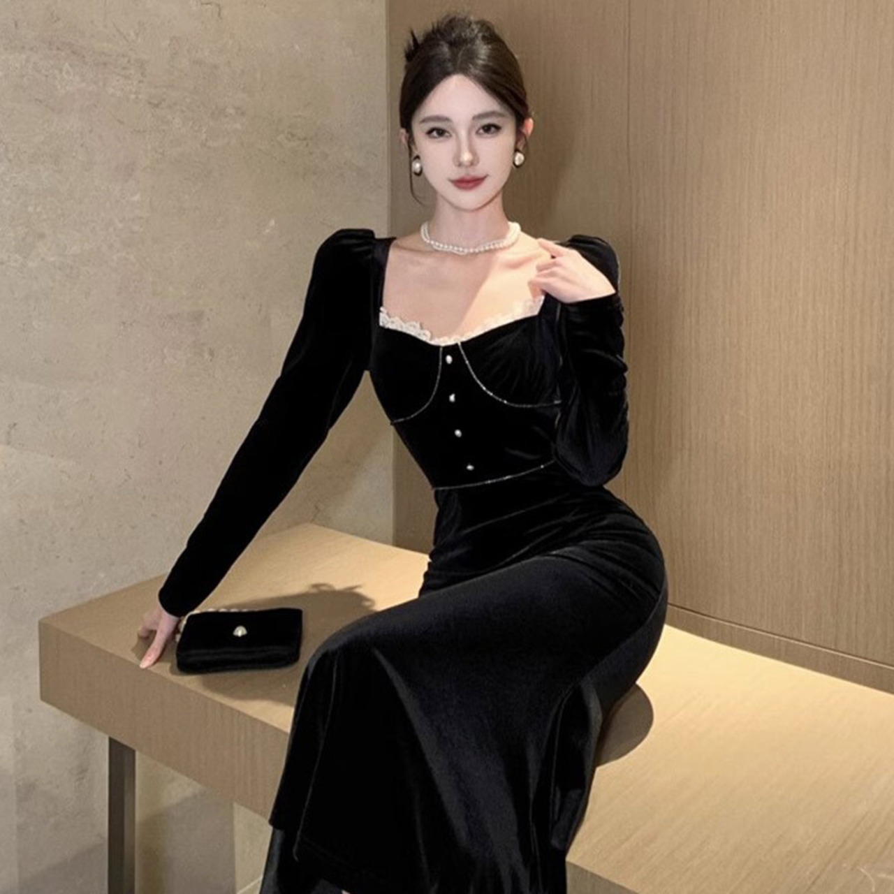 ヘップバーン スタイルのイブニング ドレス、フェミニン、ライト ラグジュアリー ニッチ、ハイエンドのフランスのセクシーな黒の見事なスクエア ネック ドレス ブラック スクウェア yeyij43586516017