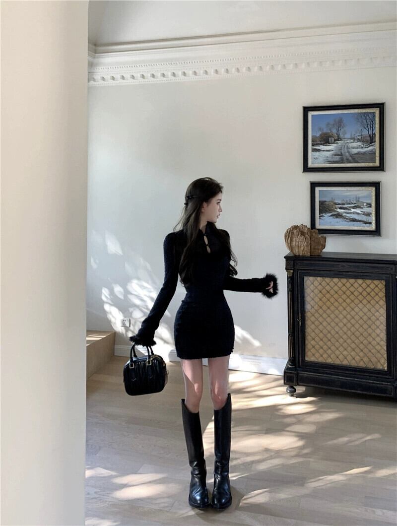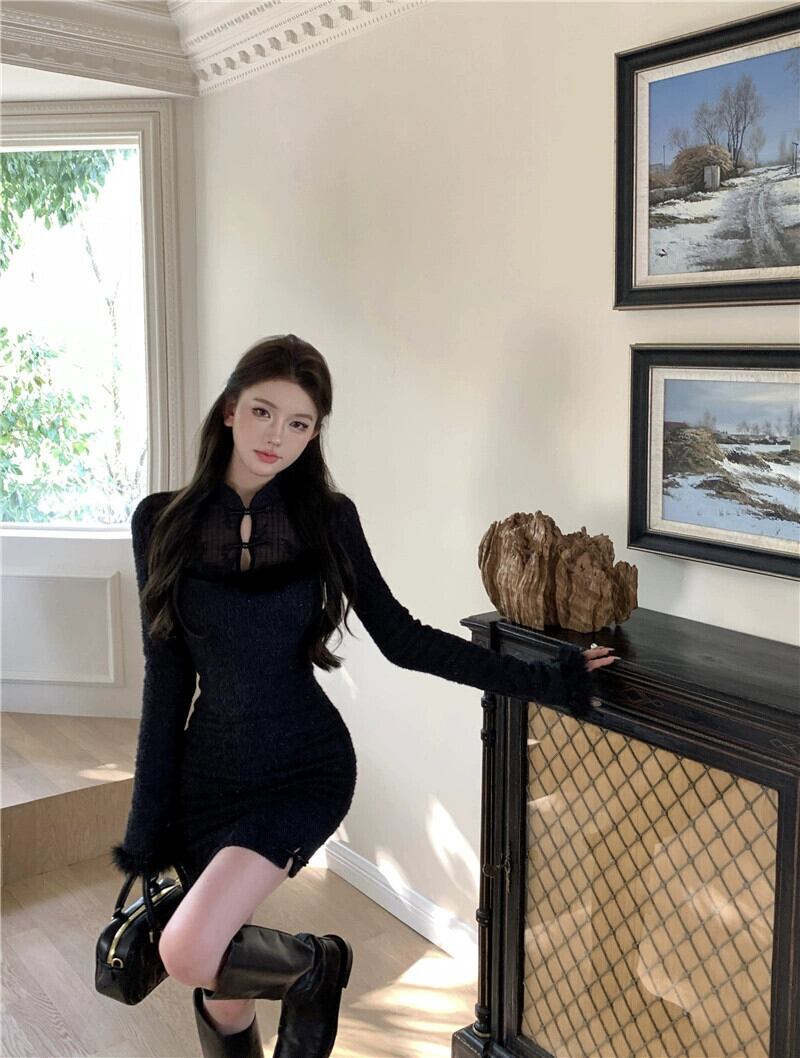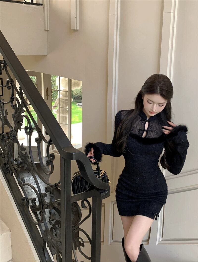 生放送の服の女性アンカー pogenic ハイエンドの若いセクシーなメッシュ スプライシング改善された黒のチャイナ ドレス ブラック yeyij44484285214