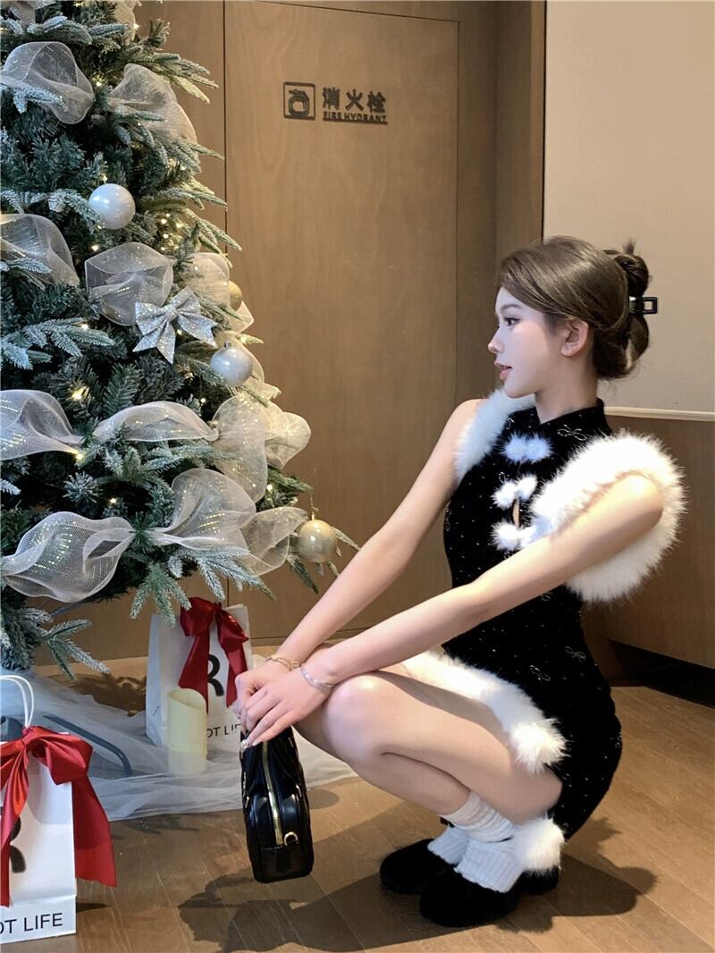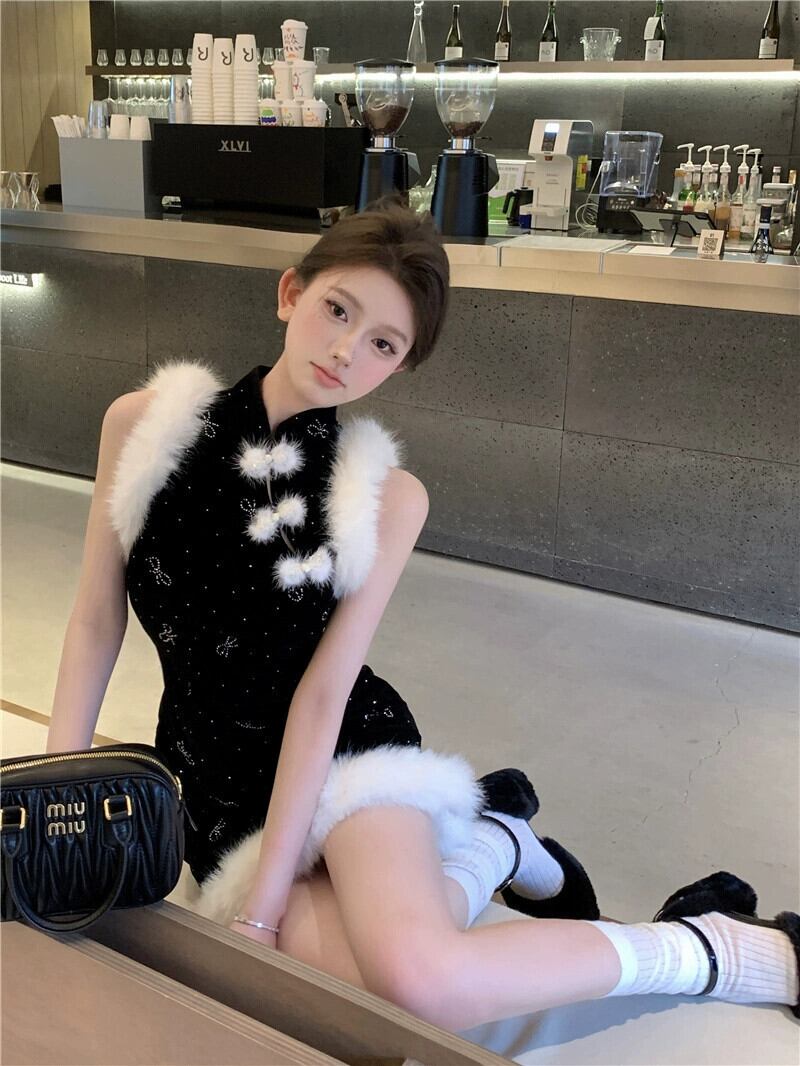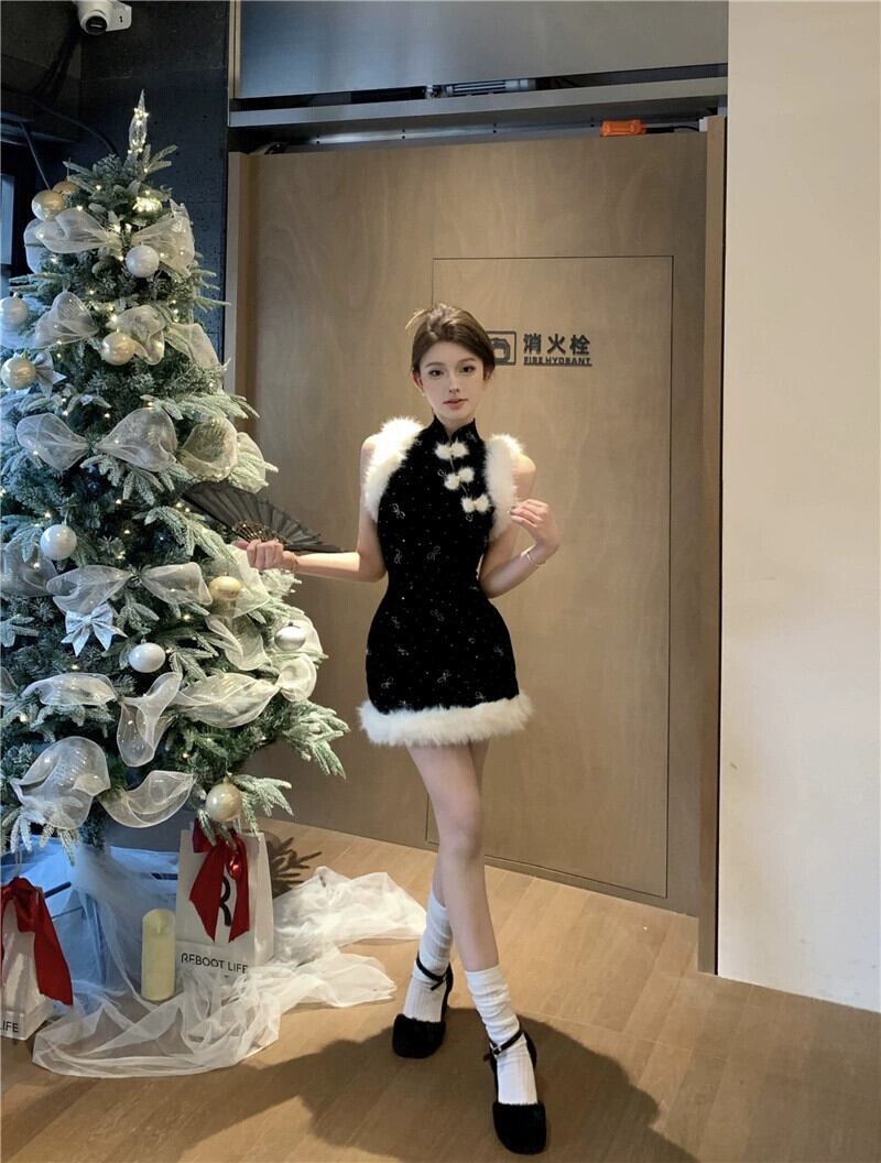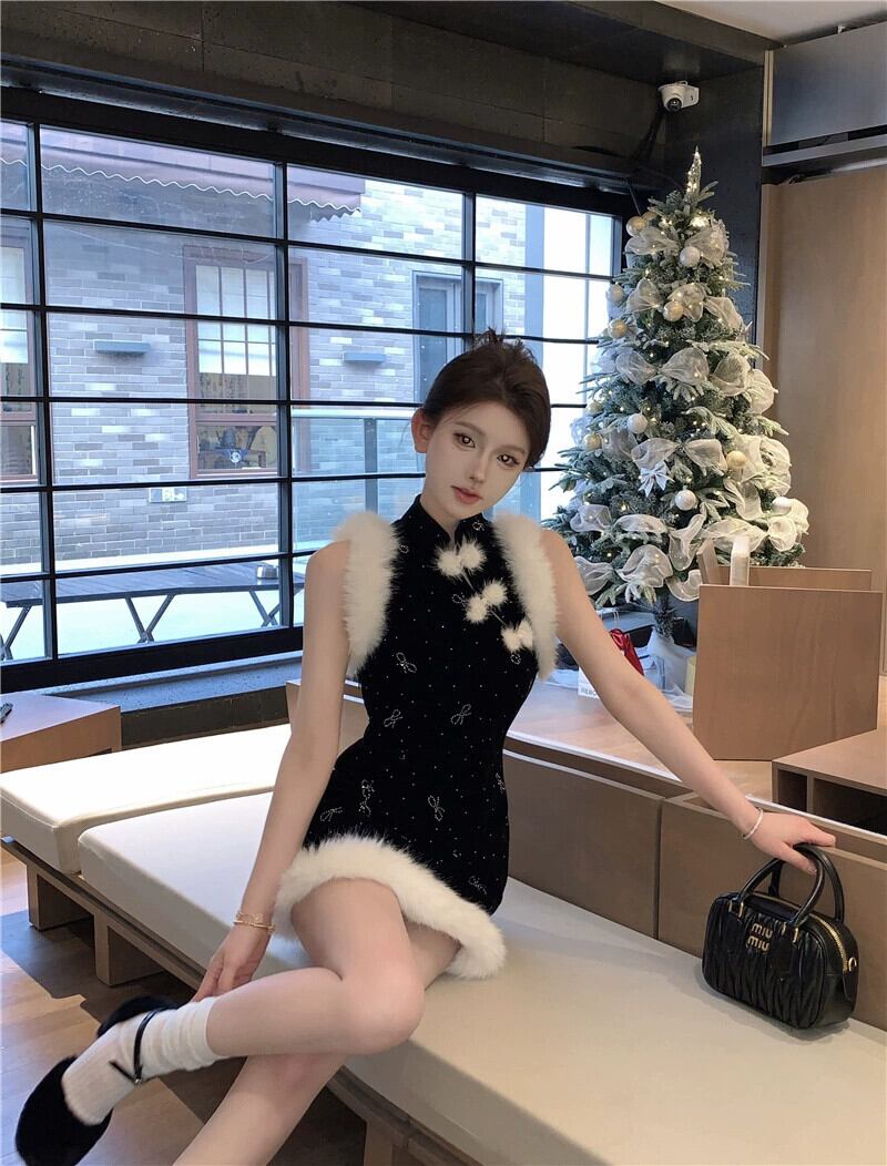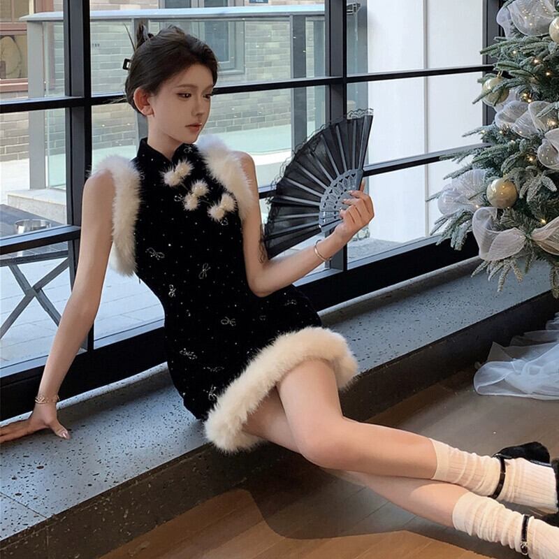 チャイナドレス、ハイエンドライトラグジュアリー、ニッチドレス、パーティースタイル、中国風のベルベットショートベストドレス yeyij46488241379