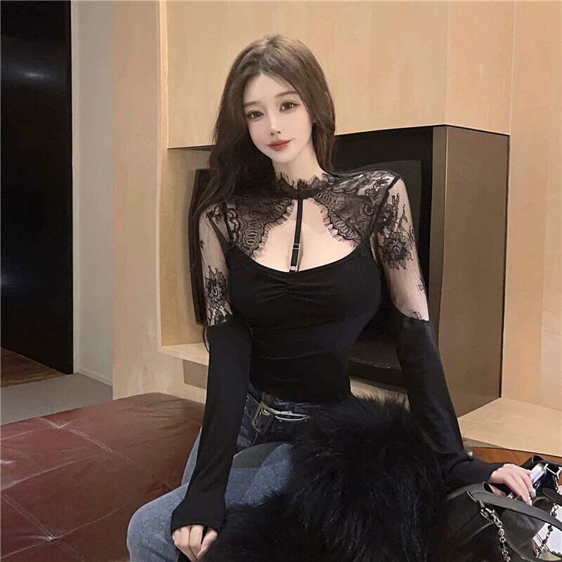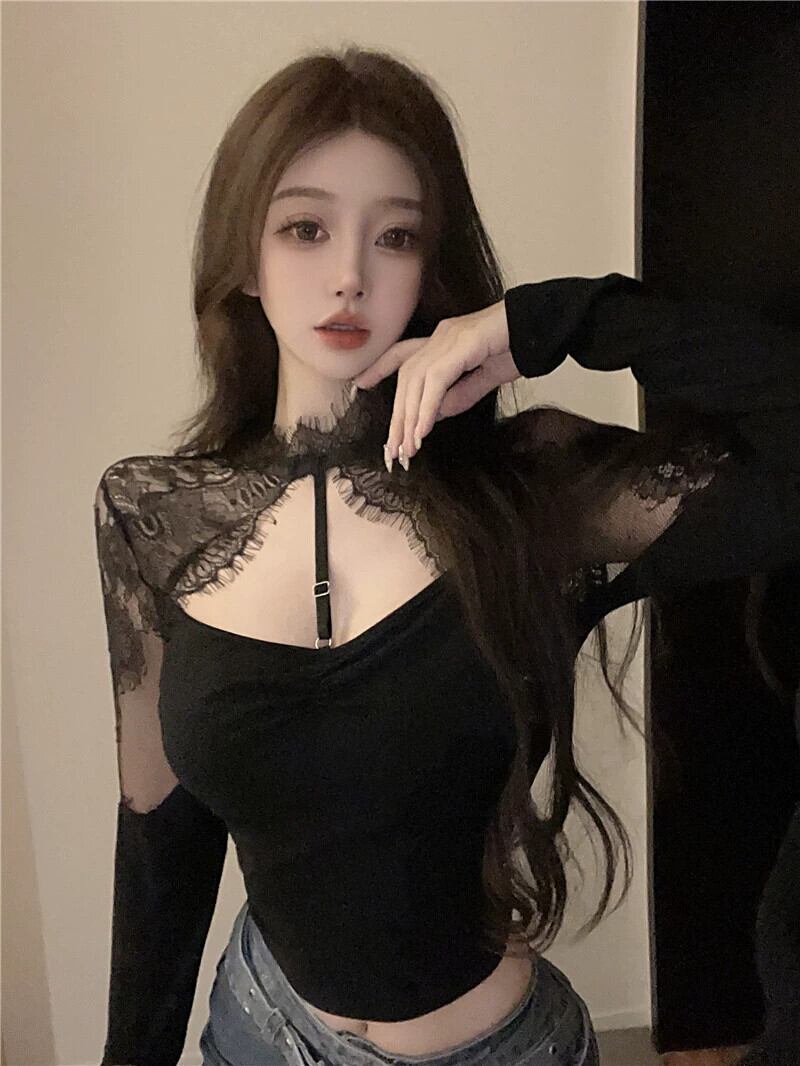 生放送の女性アンカーのポージェニックな服、ハイエンドの純粋な欲望スタイルの黒のセクシーなTシャツ、中空の背中の開いたレースのスプライシングトップ ブラック ピュア yeyij6343853867