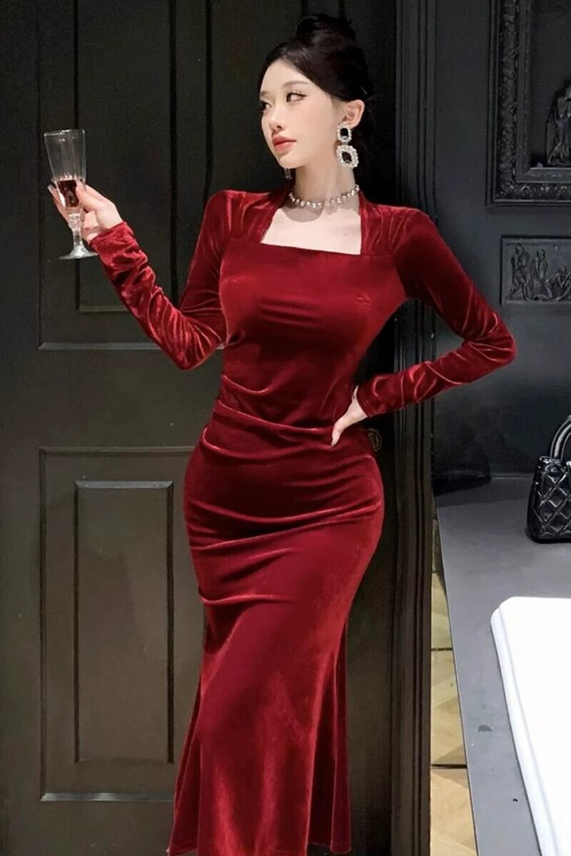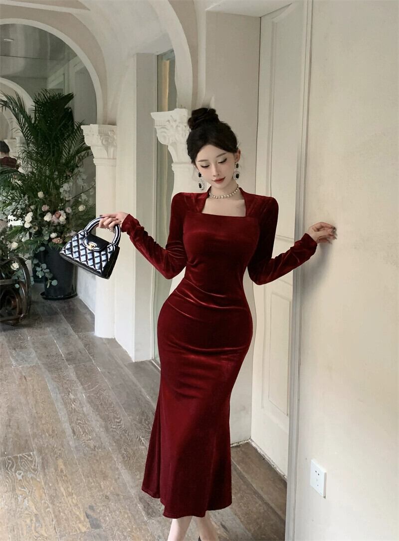 辰年、干支、レディース秋冬レッド、軽くて大人っぽいロイヤルスタイルのフレンチスクエアカラーベルベットミドル丈フィッシュテールドレス オータム 秋物 ウィンター 冬物 スクウェア yeyij15825351240