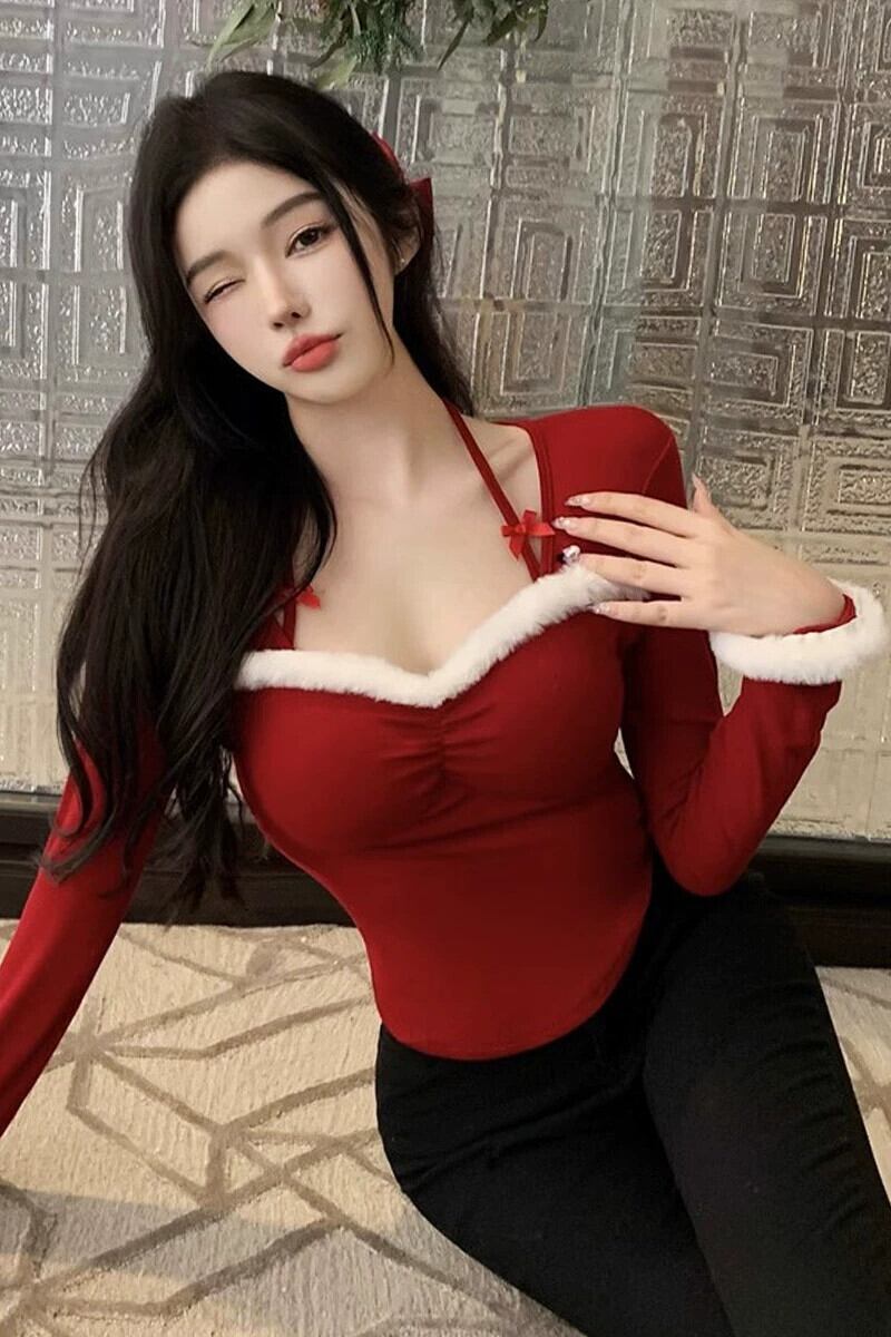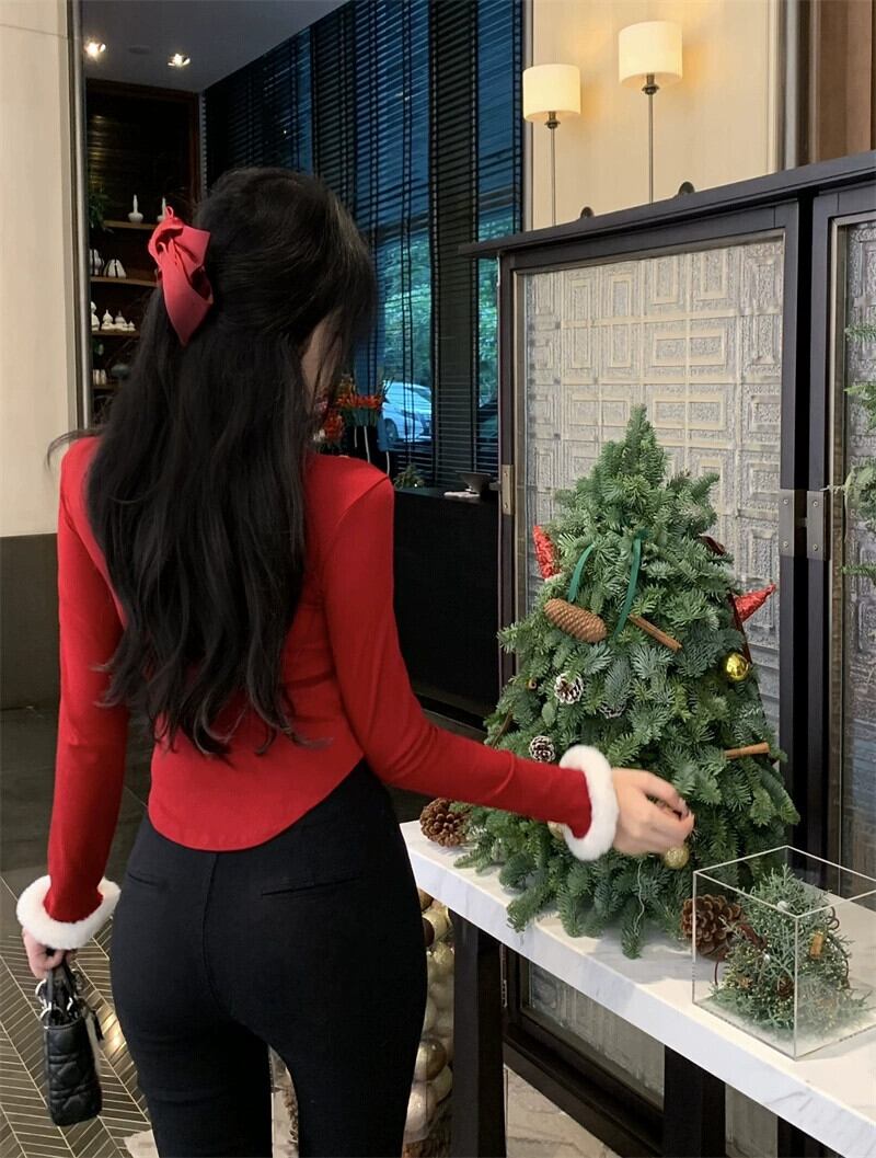 生放送の女性アンカーのポジェニックな服、高級な甘いネクタイ、純粋な欲望、年のクリスマスTシャツ、セクシーなスクエアカラーとベルベットのトップ 大人ガーリー スウィート キュート カジュアル ピュア スクウェア yeyij97927358961