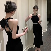ヘップバーン スタイルのイブニング ドレス、フェミニン、ライト ラグジュアリー ニッチ、ハイエンド フレンチ セクシー ブラック フィッシュテール ホルター ネック ドレス yeyij78718218387