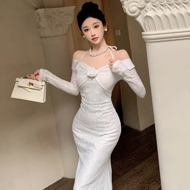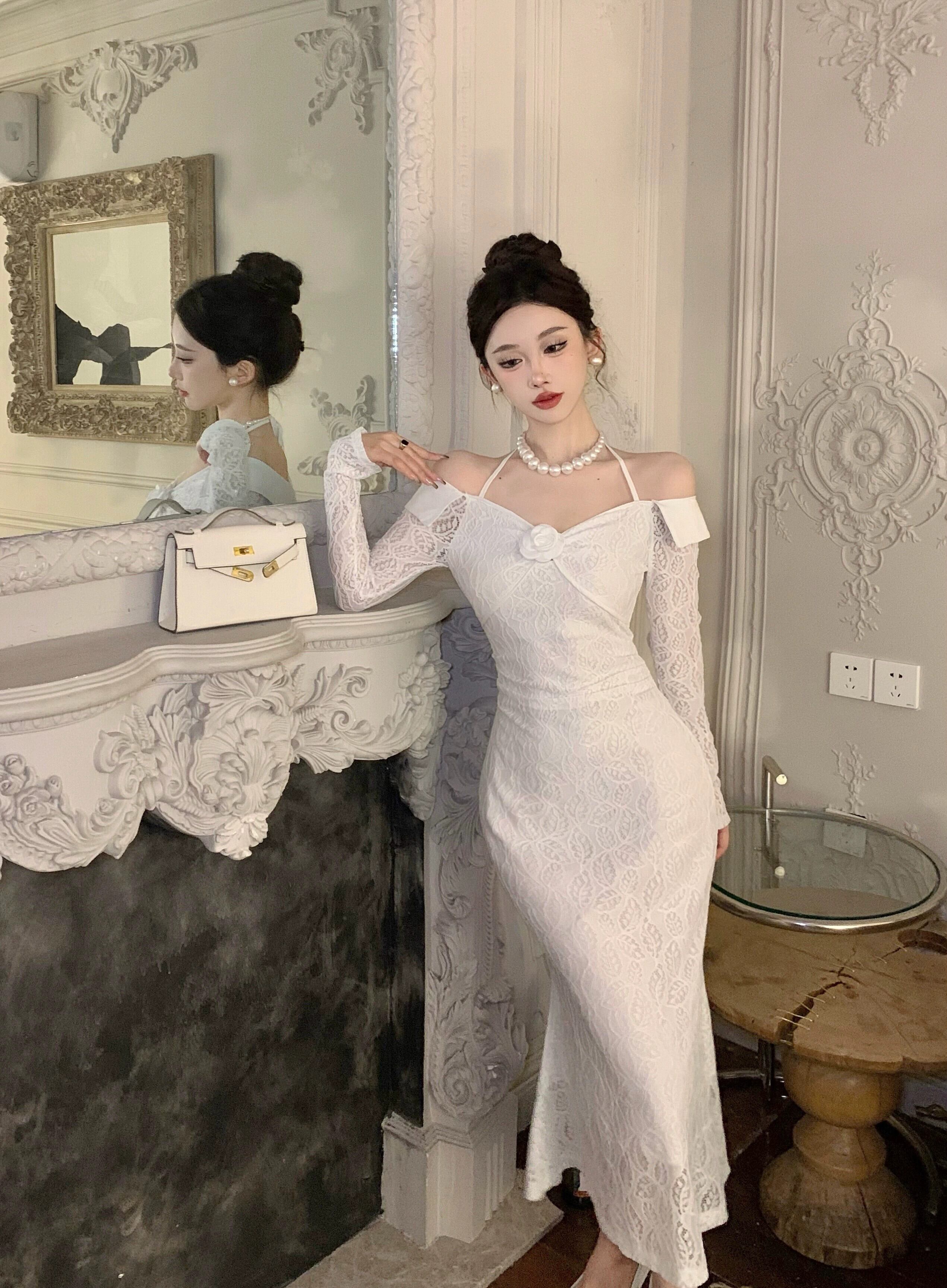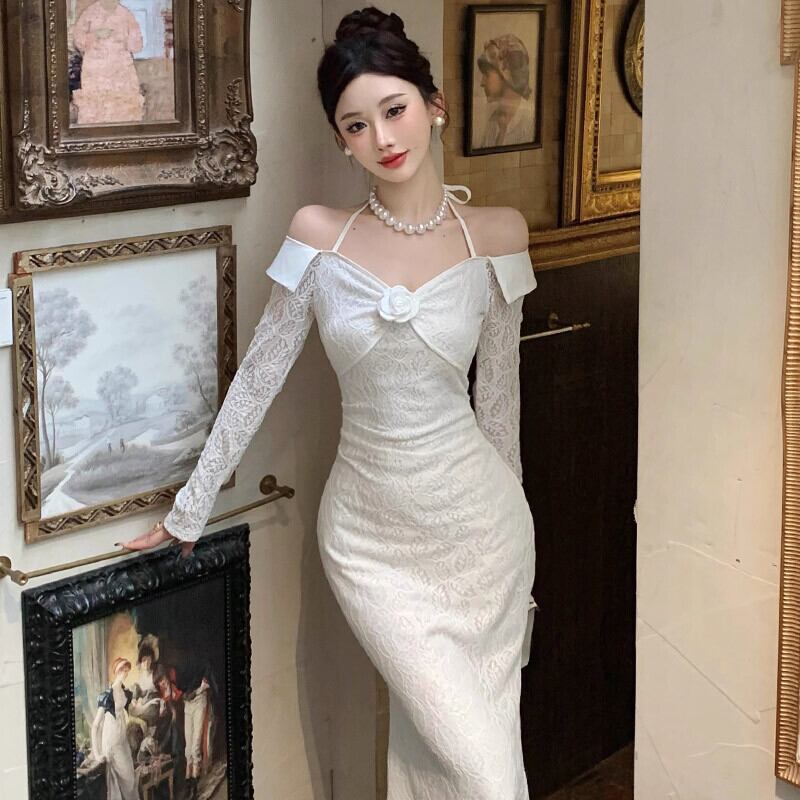 ヘップバーン スタイルのイブニング ドレス、フェミニン、ライト、ラグジュアリー、ニッチ、ハイエンド、フレンチ セクシーな白いワンショルダー ホルター ネック ドレス ホワイト yeyij48460926776