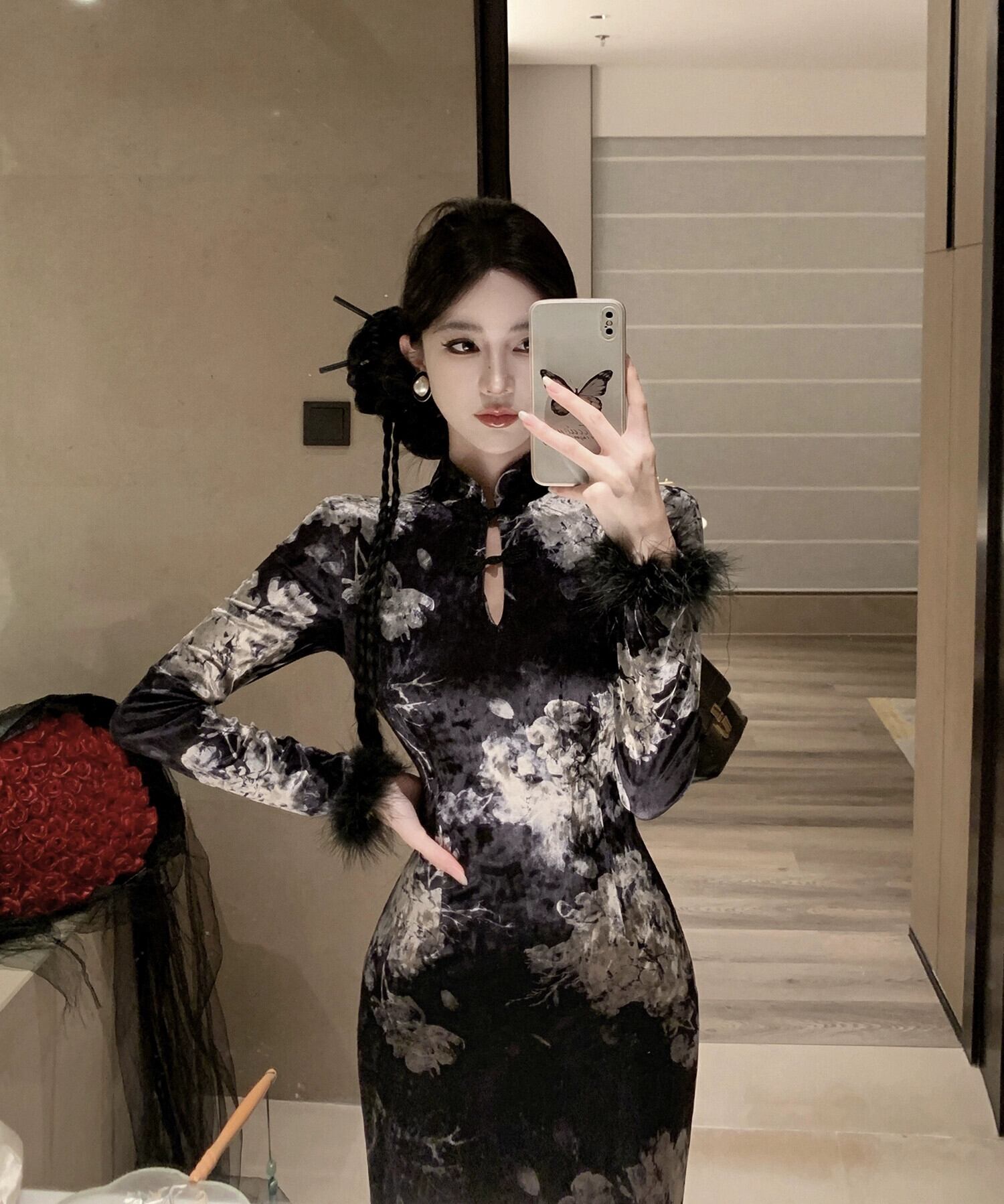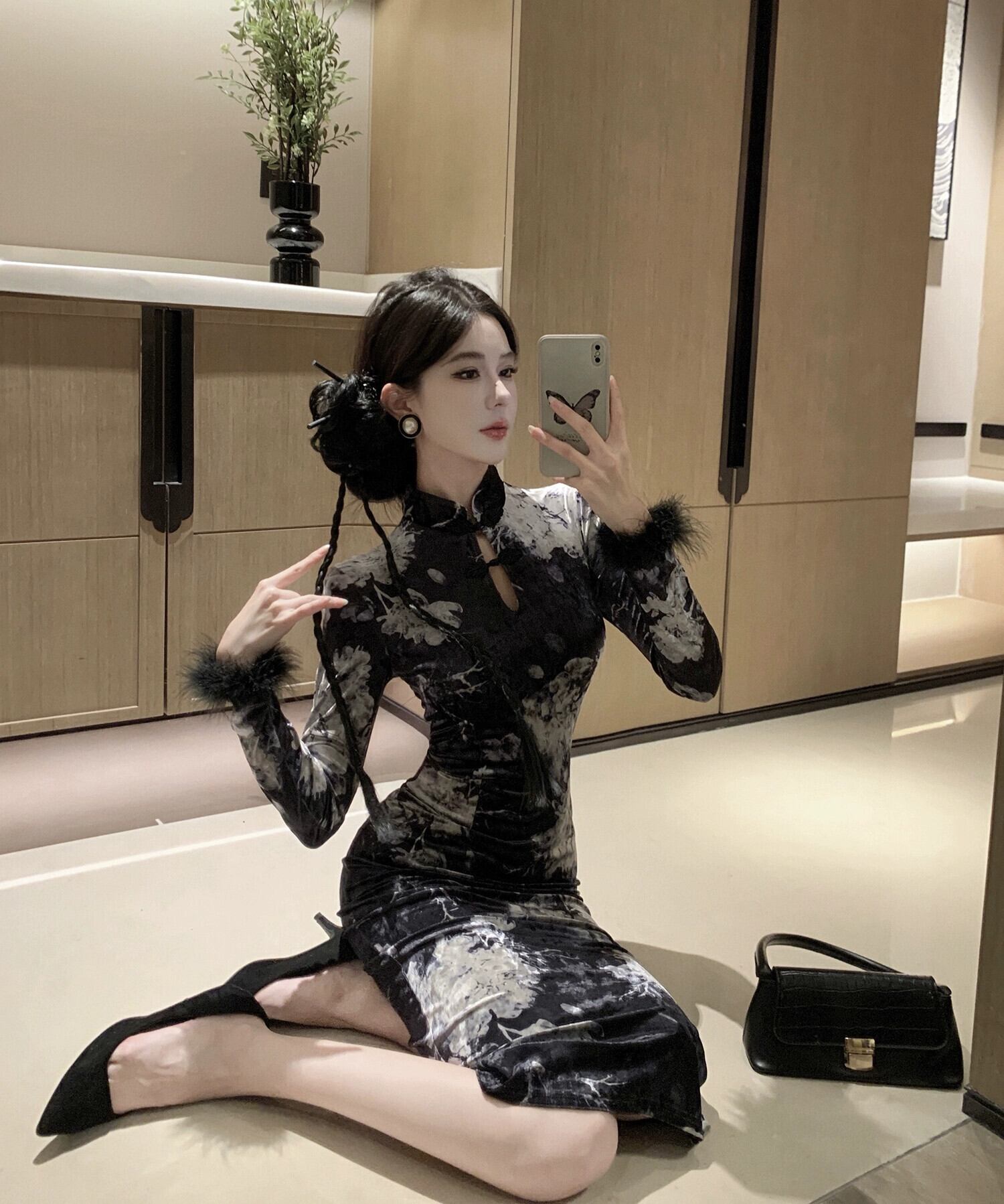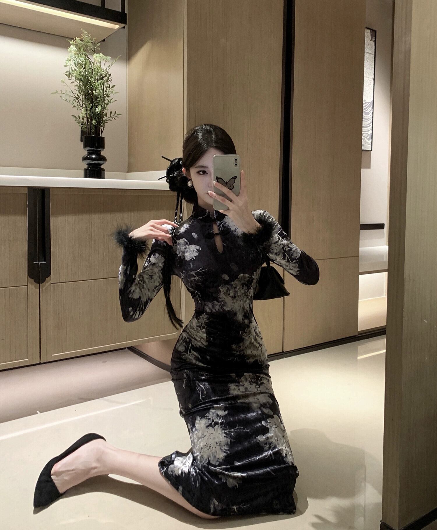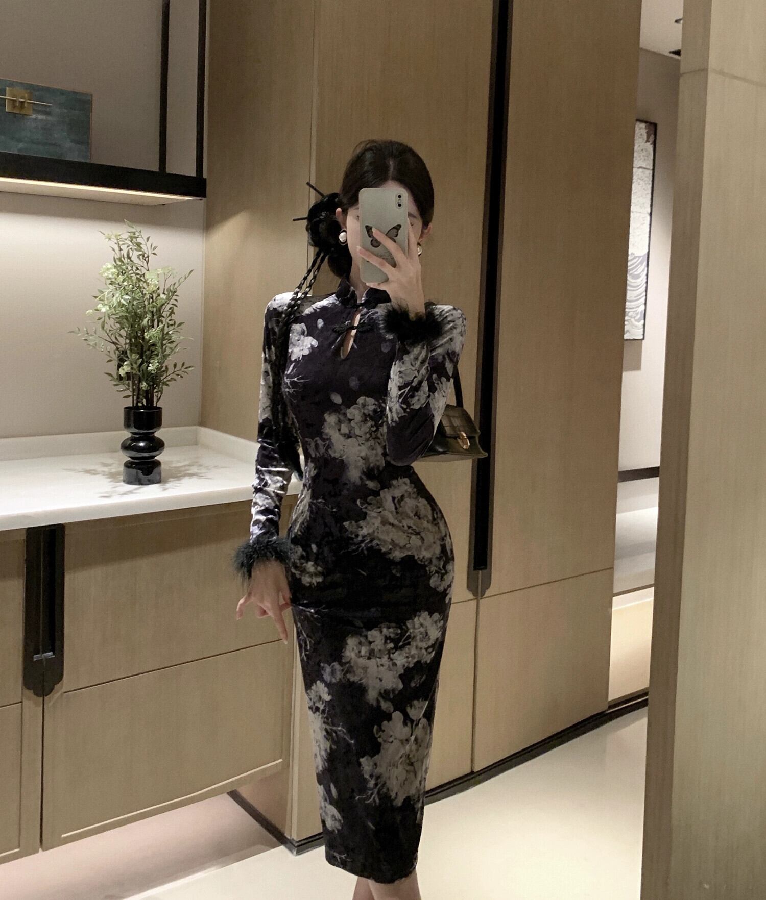 中国風のチャイナドレス秋と冬のスタイルのハイエンドの若いスタイルのレトロな中華民国スタイルのプリントゴールドベルベットの国民トレンドドレス オータム 秋物 ウィンター 冬物 yeyij28606005050