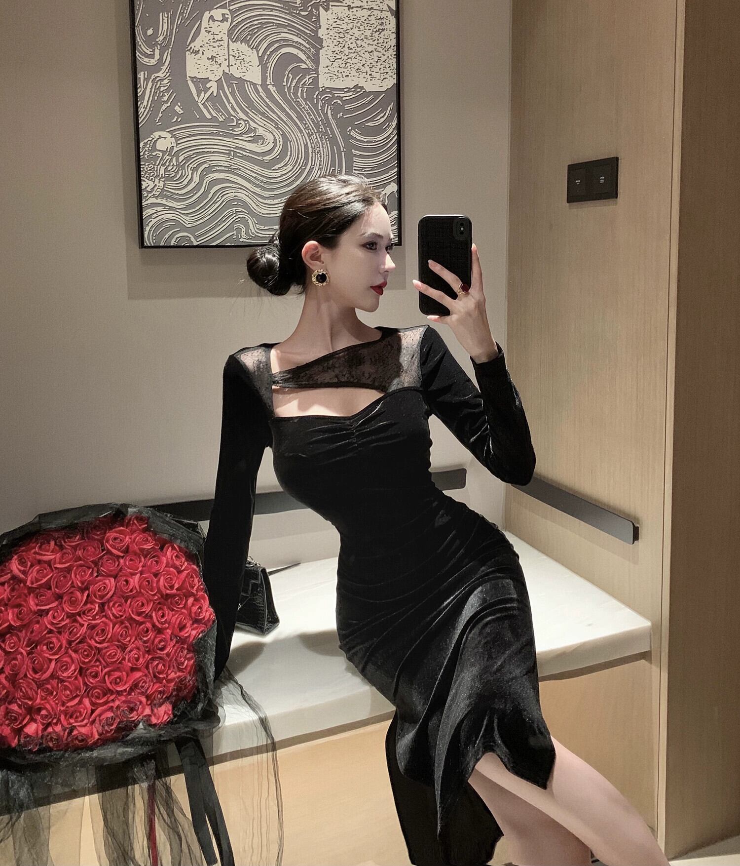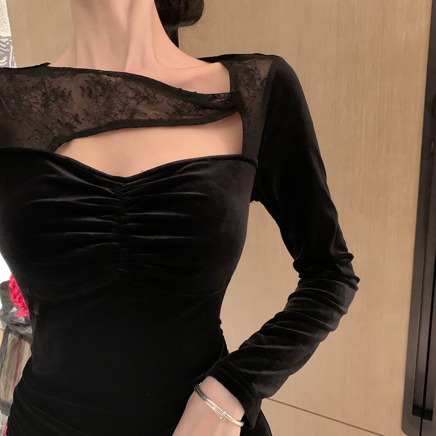 バンケットイブニングドレス、高級女性年次総会、フレンチセクシーな中空スラントカラー、オフショルダーブラックゴールドベルベットドレス yeyij99365916139