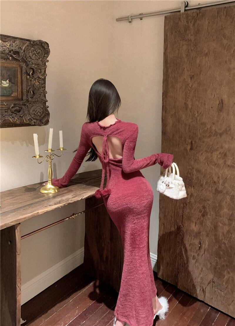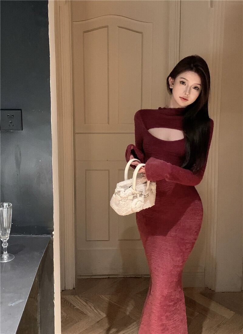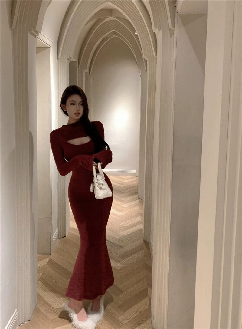 干支年女性の秋冬春レッド純粋な欲望セクシーな中空バックレスフィッシュテールボトリングロングスカート豪華なドレス スプリング 春物 オータム 秋物 ウィンター 冬物 ピュア yeyij7981033178