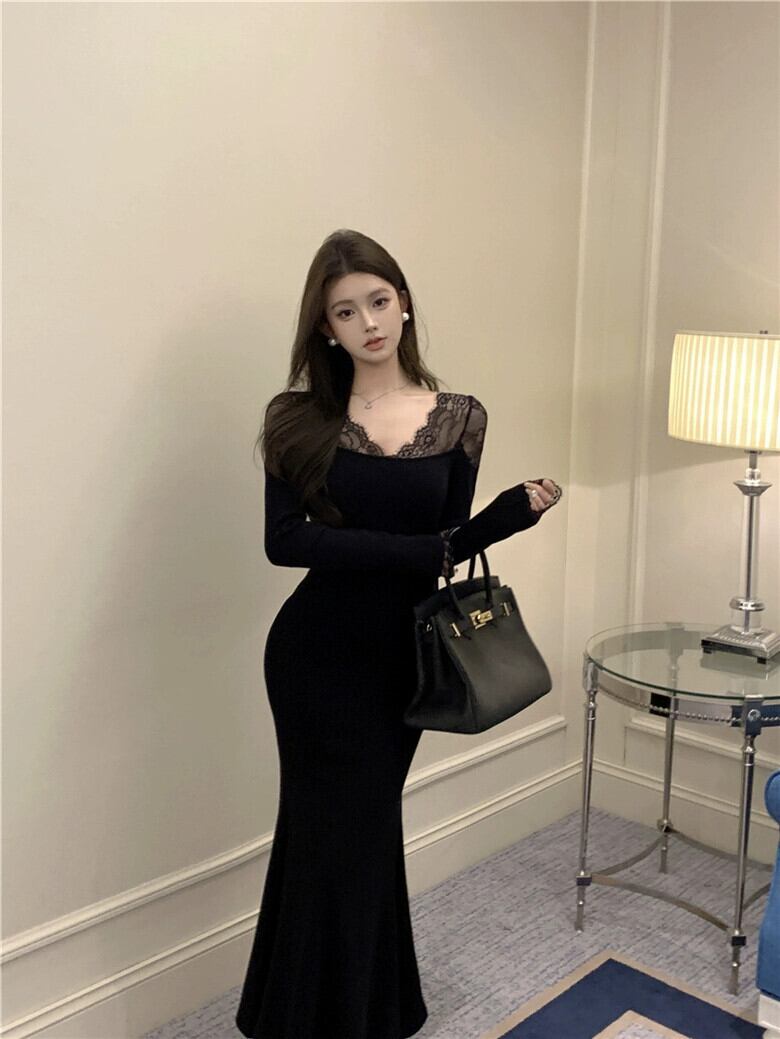 ヘップバーン スタイルのイブニング ドレス、フェミニン、ラグジュアリー、ニッチ、ハイエンドのフランスのセクシーなブラック レース スプライシング ドレス yeyij2242795320