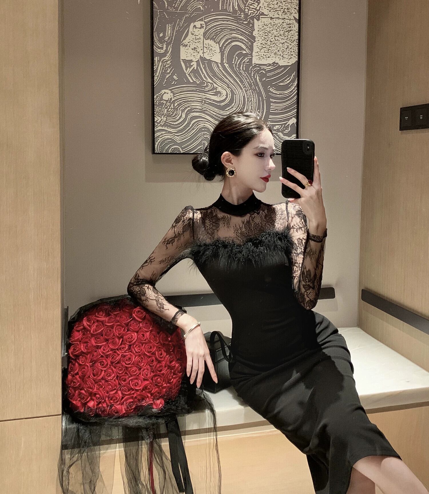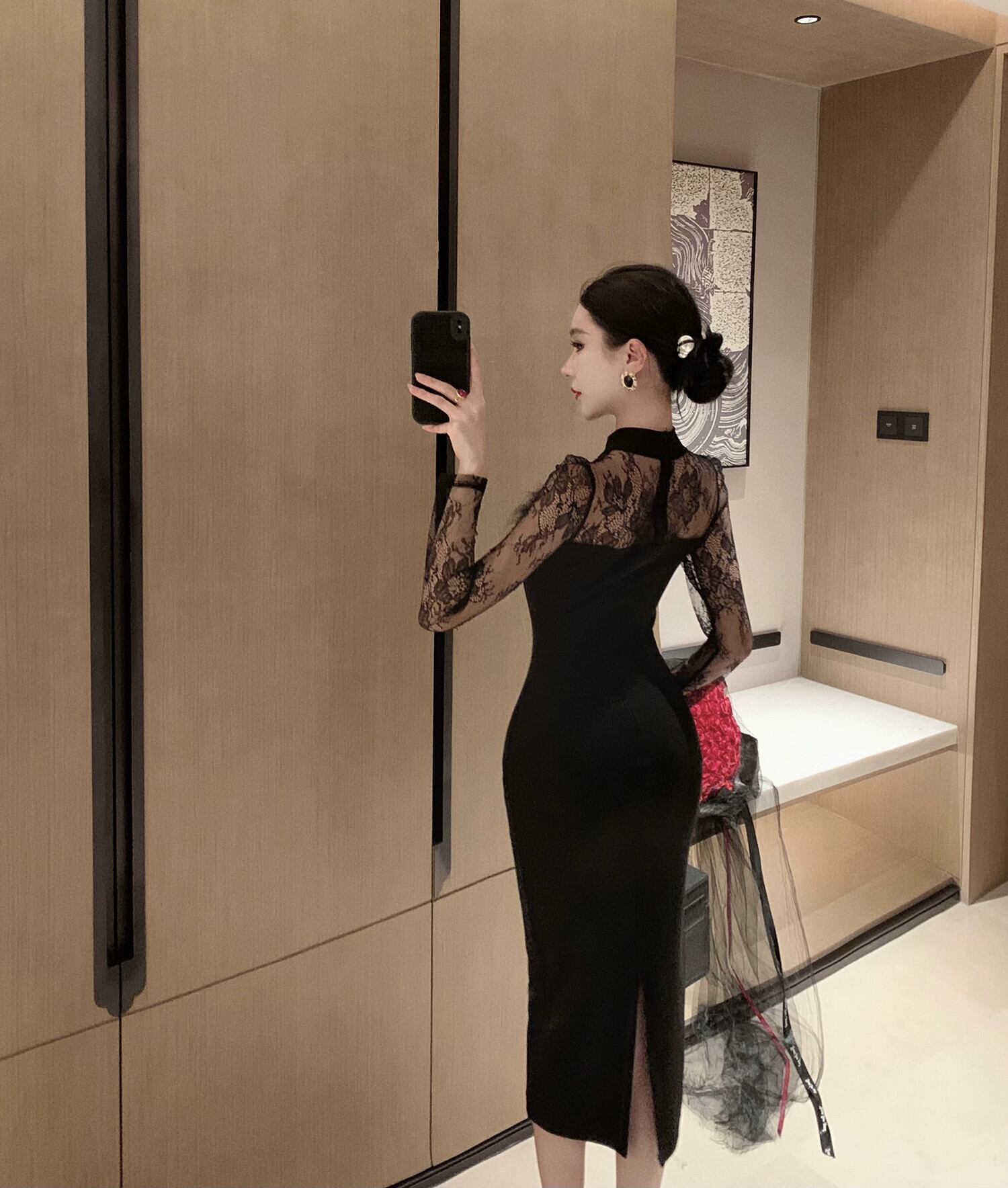 年次総会のイブニングドレスの女性、黒のフレンチヘップバーンスタイル、淑やかな気質、セクシーなレースのスプライシングドレス ブラック yeyij25678711256