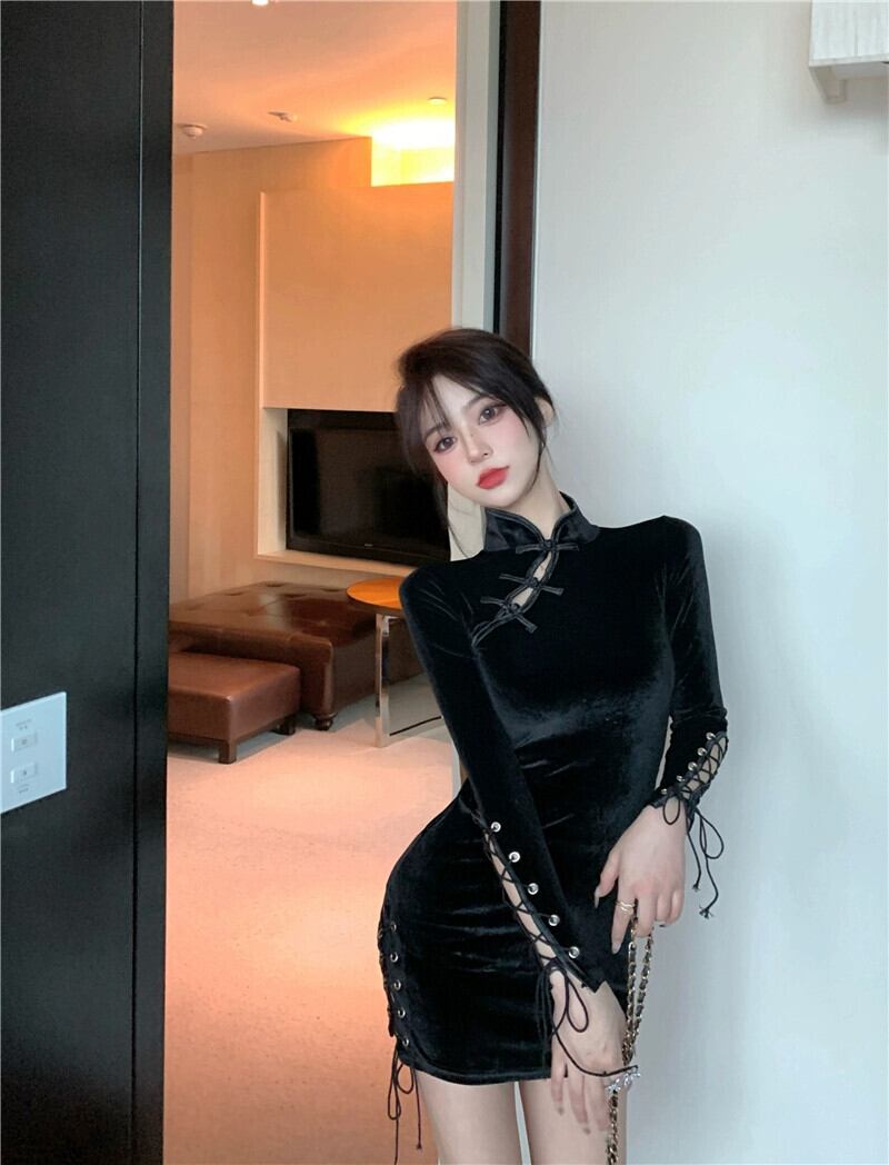 2023年春の新しい若いスタイルの中国風ネクタイセクシーなゴールドベルベットの改良されたチャイナドレス スプリング 春物 yeyij83701785544
