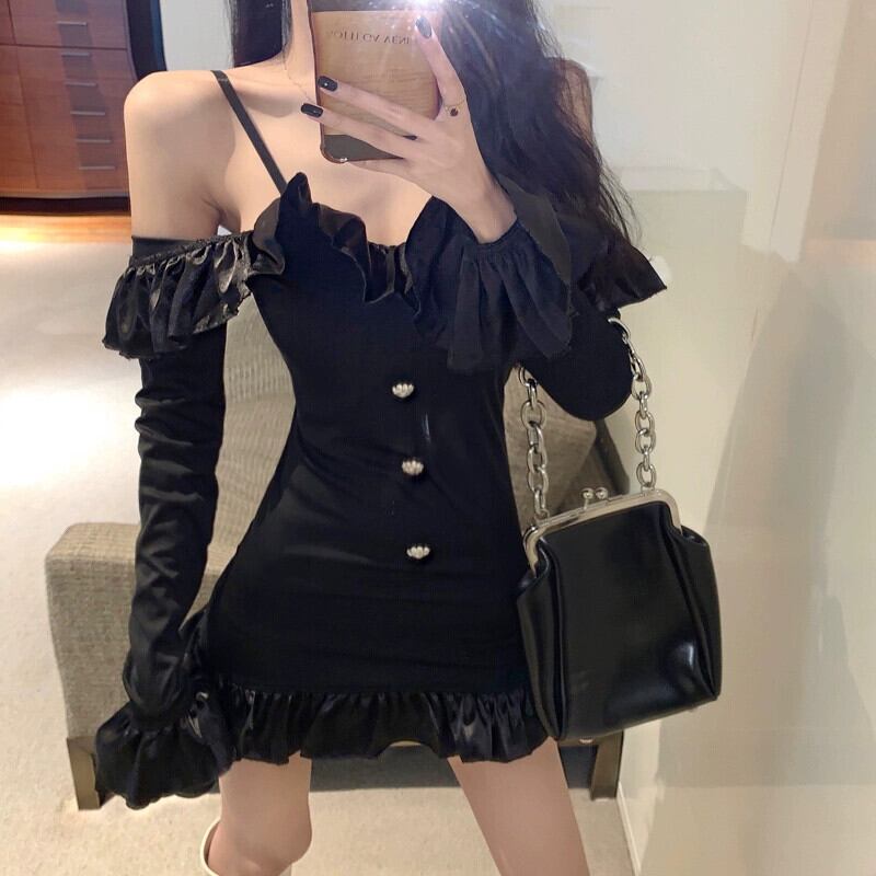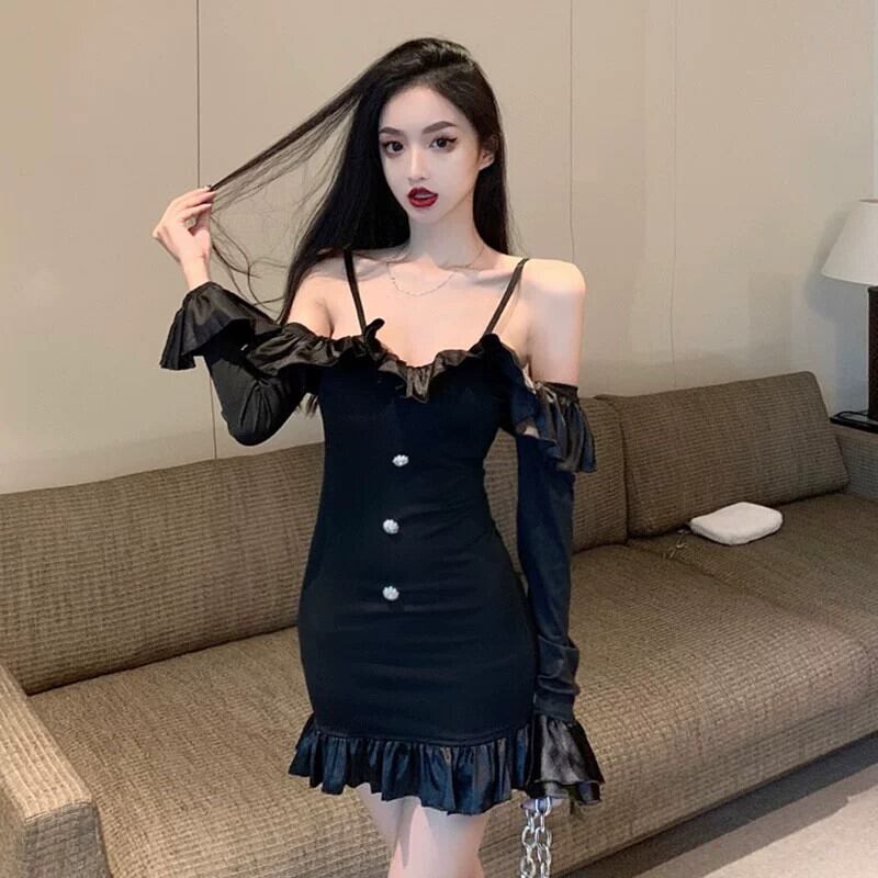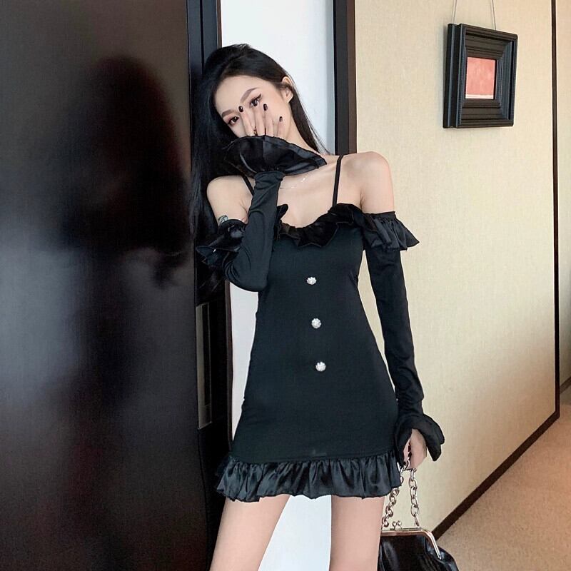 生放送服女性アンカー pogenic ハイエンドフレンチフリルセクシーなワンショルダー長袖フィッシュテールサスペンダードレス ロング yeyij97704888362