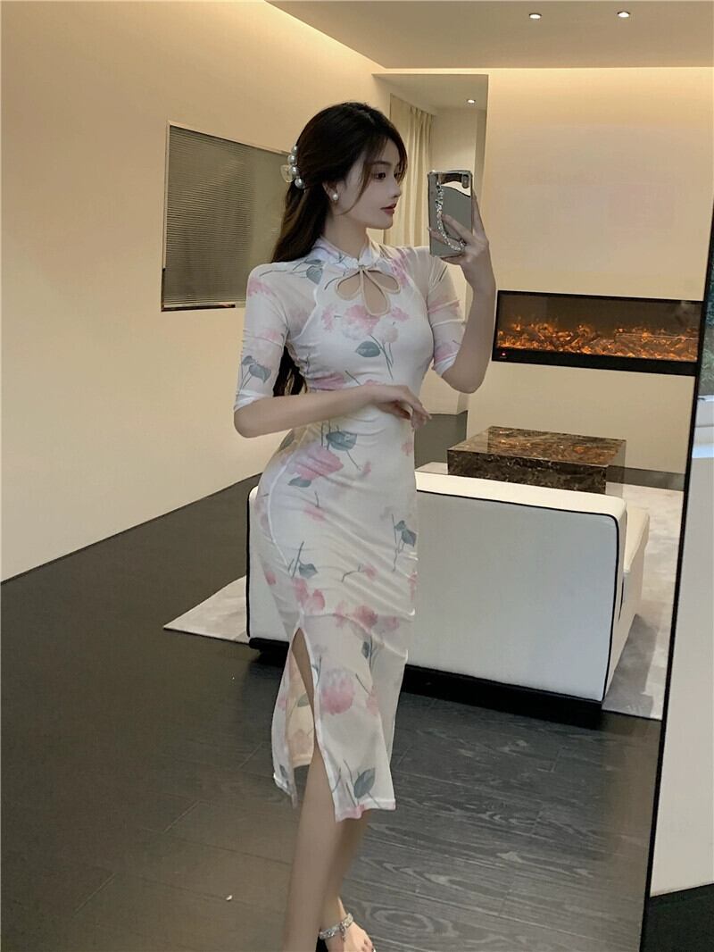 チャイナドレス 2022 新しいスタイルの若いレトロプリント y 気質セクシーなスリットメッシュミッドレングスドレス yeyij69207908664