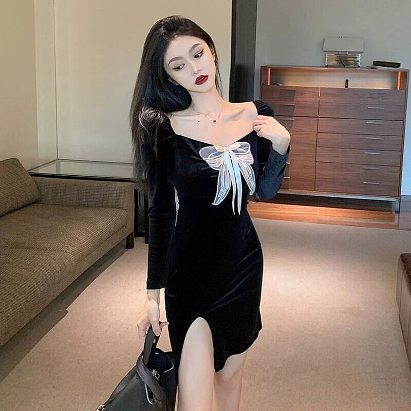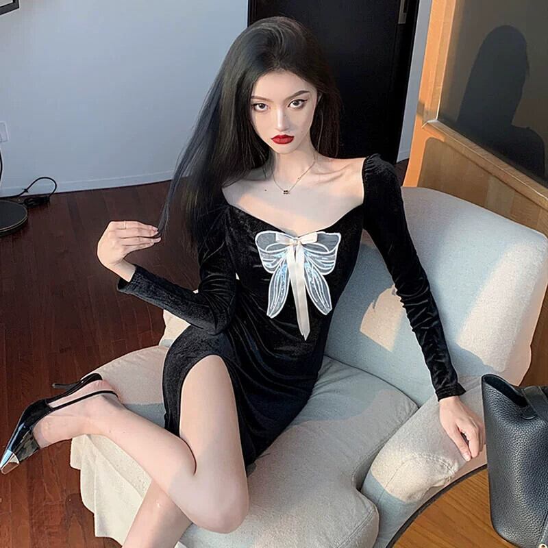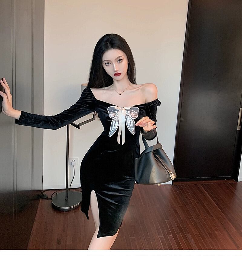 イブニングドレスの女性の秋と冬の宴会ショートスカート気質フレンチセクシーなスクエアネックヒップスリットゴールドベルベットドレス オータム 秋物 ウィンター 冬物 スクウェア yeyij50757757836