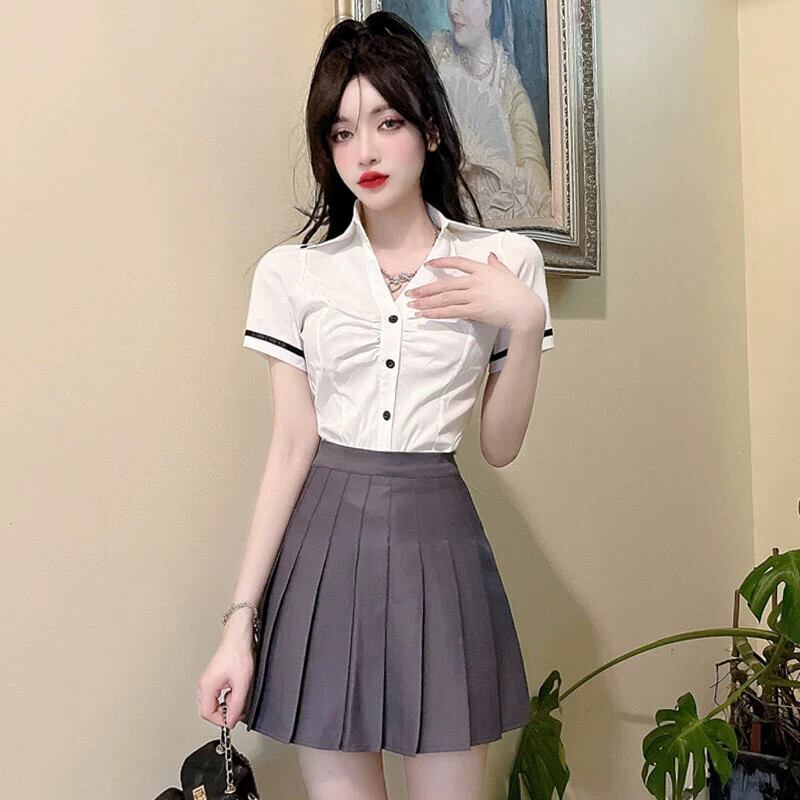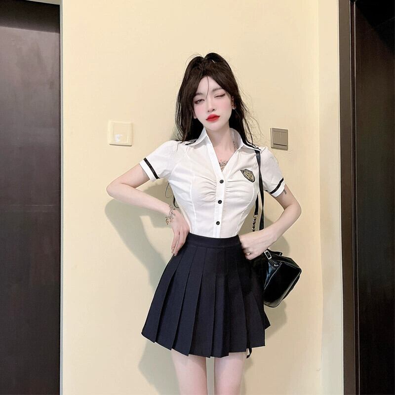JK UNIM 作業服スーツ レディース 夏 英国カレッジスタイル 半袖デザイン ニッチトップ ホワイト Vネックシャツ サマー 夏物 yeyij57968119532