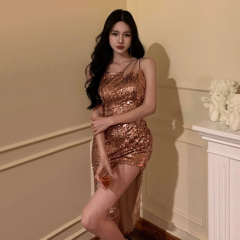 ゴールドのセクシーなスパンコールサスペンダードレス、光沢のある、ハイエンド、ライトラグジュアリー、ハイエンドパーティーイブニングドレス yeyij39901839905