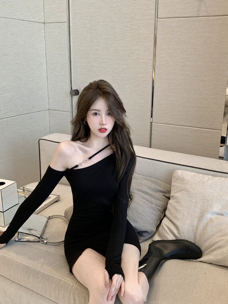 2023 春の新スタイルの女性インターネット有名人ネクタイセクシーな傾斜襟ワンショルダーオフショルダー黒長袖ヒップカバードレス ロング ブラック スプリング 春物 yeyij19842852108