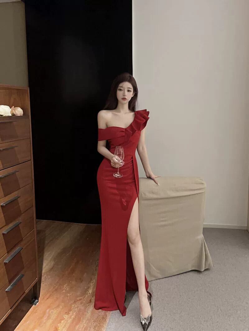 イブニングドレス ロングドレス 女性 高級宴会スタイル フレンチ フリル スリット セクシーなスラントカラー オフショルダー ドレス yeyij75289639871