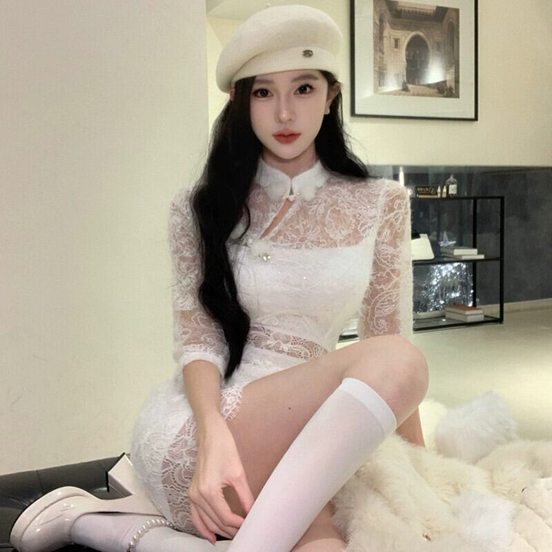 生放送服女性アンカー pogenic 白若いセクシーなレースメッシュスプライシング改良版チャイナドレス ホワイト yeyij31934713136