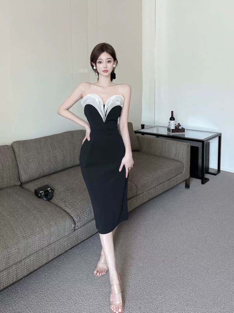 ヘップバーン スタイルのイブニング ドレス、フェミニン、ライト ラグジュアリー ニッチ、ハイエンドのフランスのセクシーな黒のストラップレス ドレス ブラック yeyij32304889793
