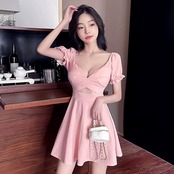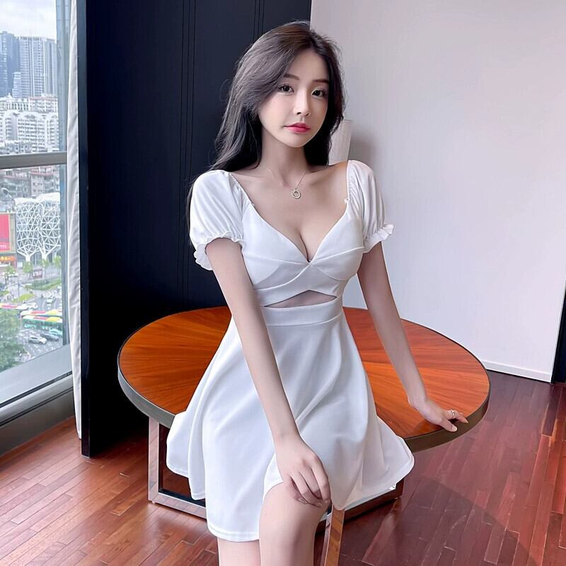 ナイトクラブの女性のフレンチ パフ スリーブ セクシーなローカット ディープ V ネック メッシュ パッチワーク ウエスト痩身ドレス Vネック yeyij48944172234