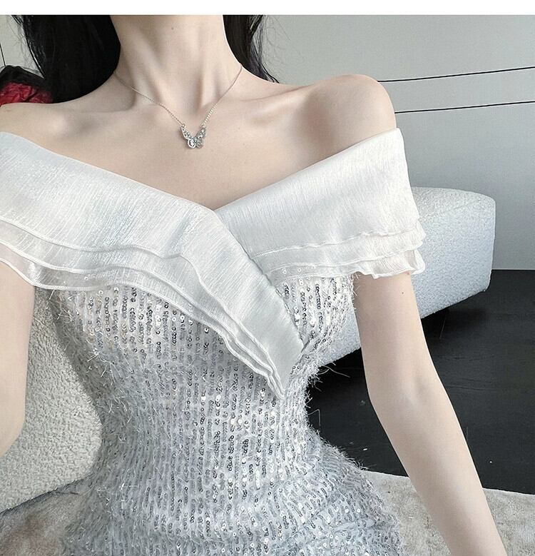 フランスのスパンコールイブニングドレスの女性 2023 新しいスタイルのハイエンド宴会気質ショートセクシーなワンショルダードレス yeyij64334813269
