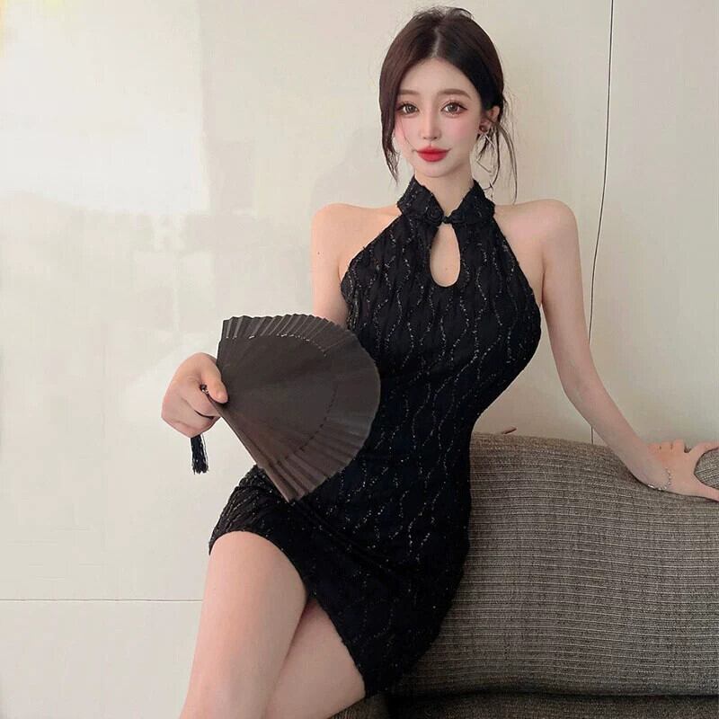 生放送の服、ポジェニックな女性アンカーの服、光沢のあるセクシーなオフショルダーの新しい中国風の改良されたホルターネックのチャイナドレス yeyij39143992108