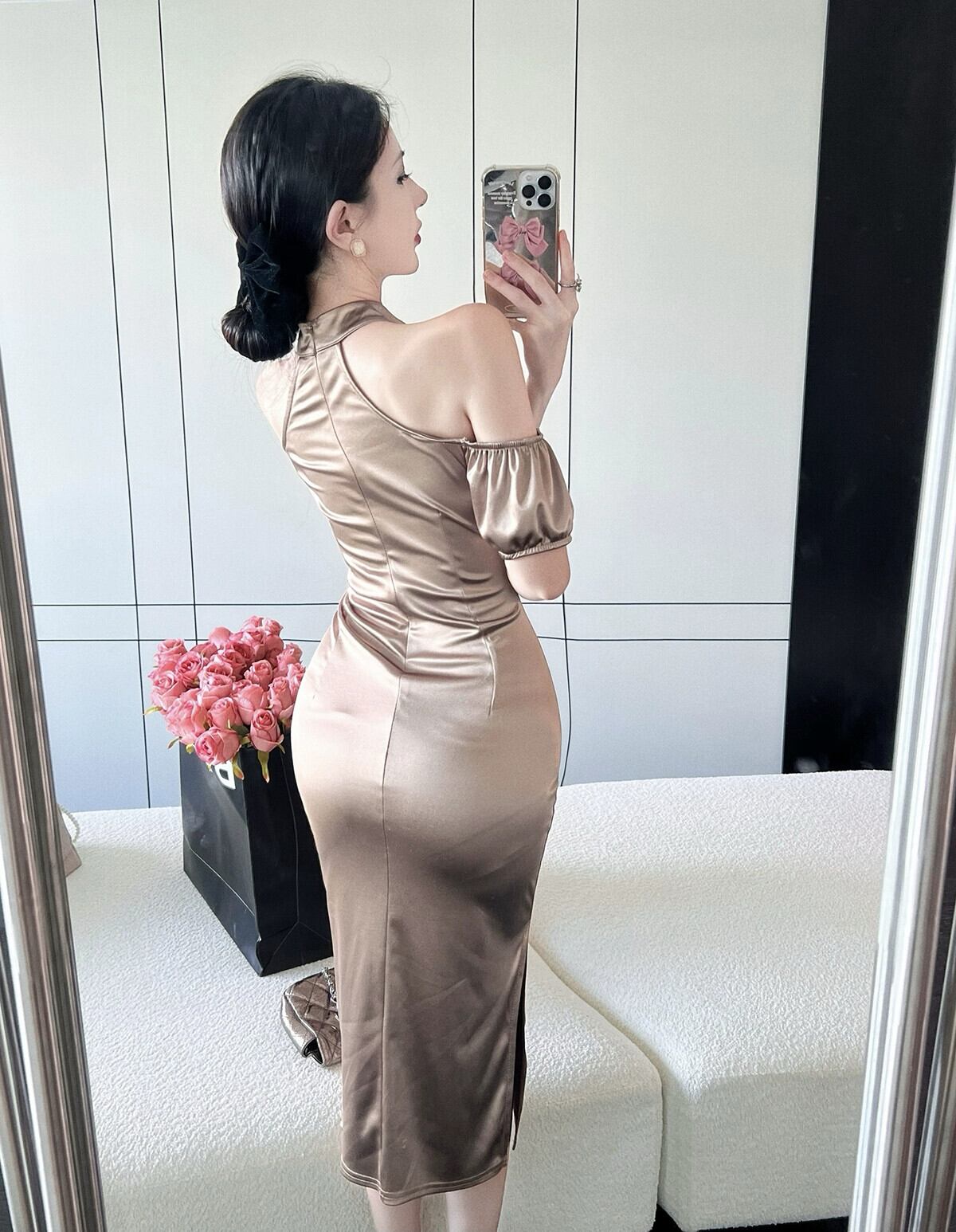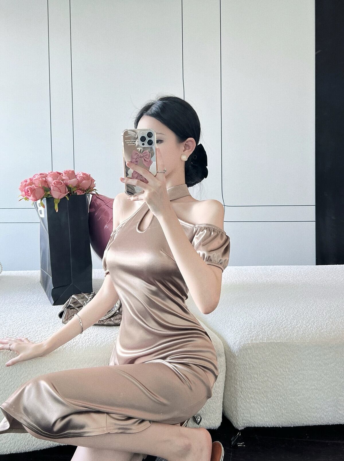 チャイナイブニングドレス 2022 新しいハイエンド軽くて成熟した気質セクシーなオフショルダーサテンミッドレングスホルターネックドレス yeyij6972690582