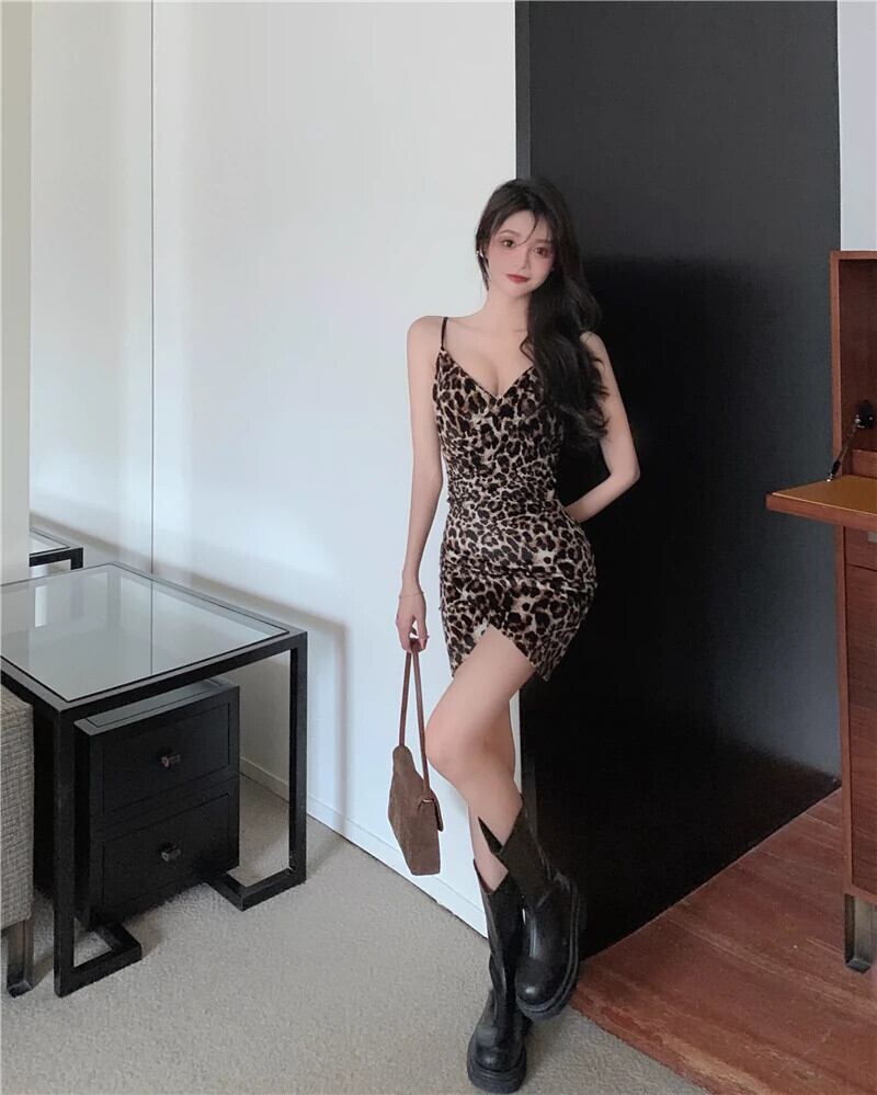 ナイトクラブレディース作業服、スリムでセクシーな作業服、ローカットVネックヒョウ柄サスペンダードレス yeyij90777964333
